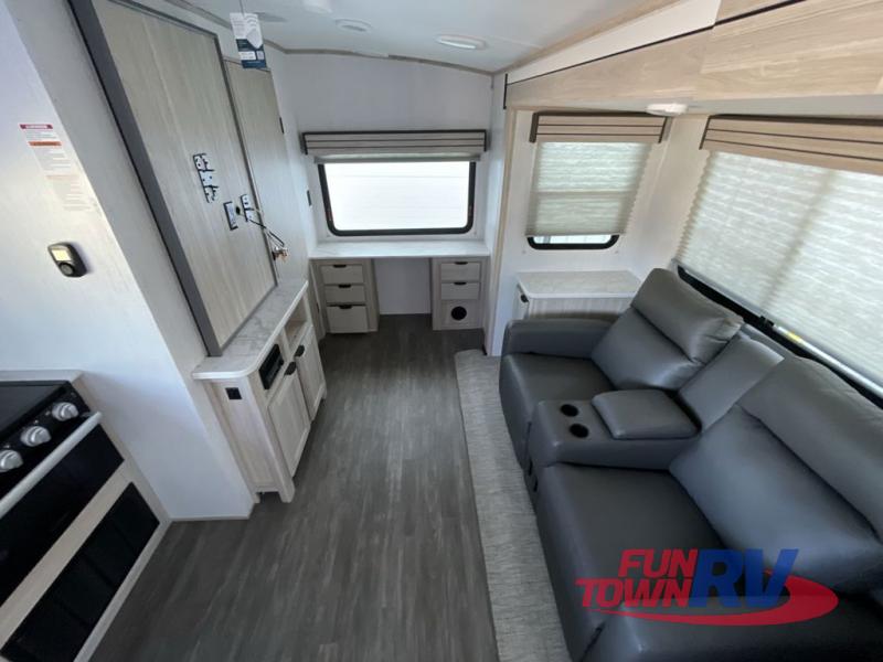 If you need to get a little work done while you are away then this travel trailer is perfect for you with the rear desk! The single slide provides more walking around space and houses the U-shaped dinette, 10.7 cu. ft. refrigerator, and pantry that is big enough to hold all of your favorite snacks. The front patent pending king bed sliding system has a pet palace underneath with a cruise-thru storage design and there are wardrobes on either side to keep your clothes looking their best, plus a privacy curtain to draw while you change or sleep. The exterior full belly storage system is big enough for all of your outdoor gear and the 15' electric awning has LED lights to highlight the good times at night!