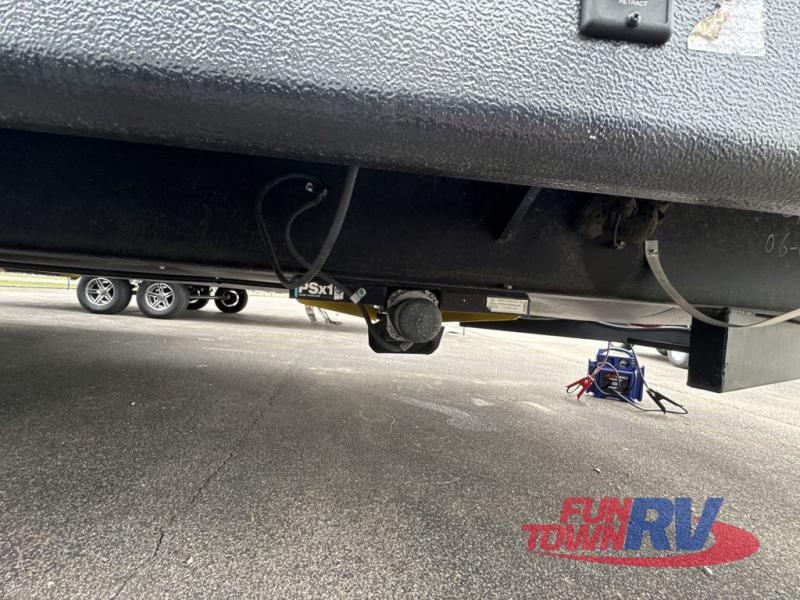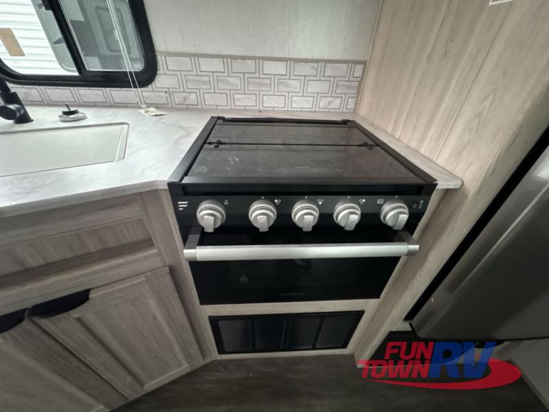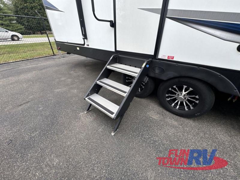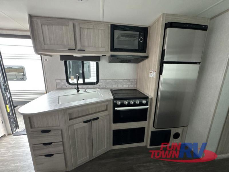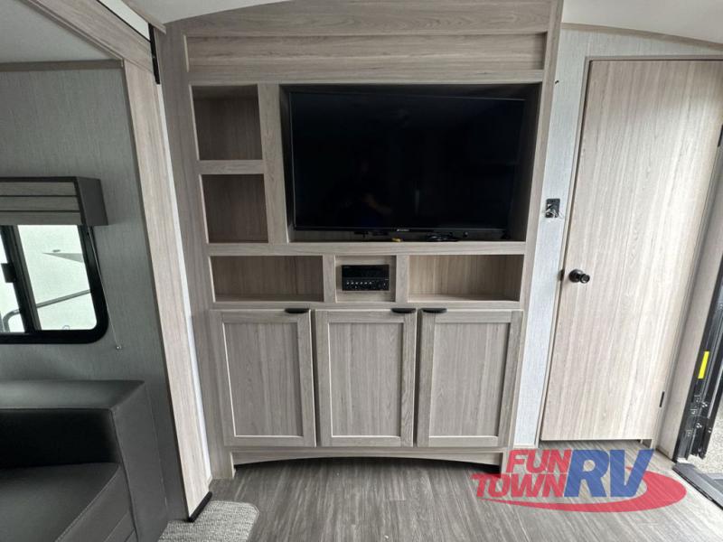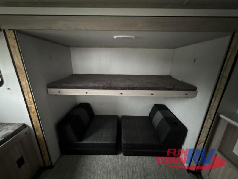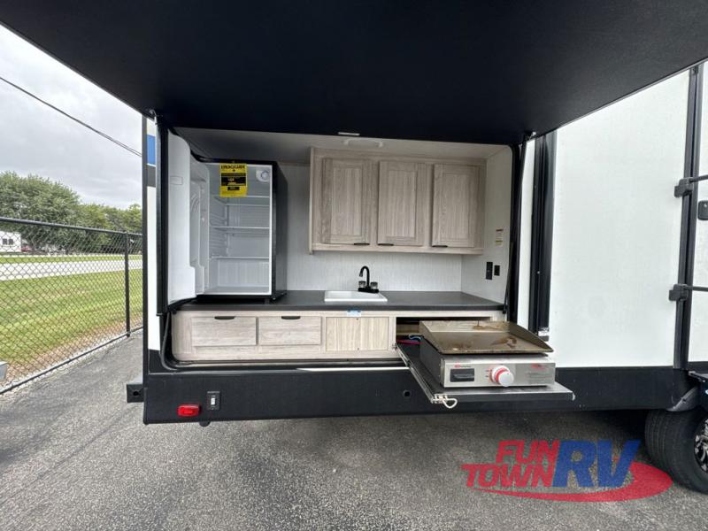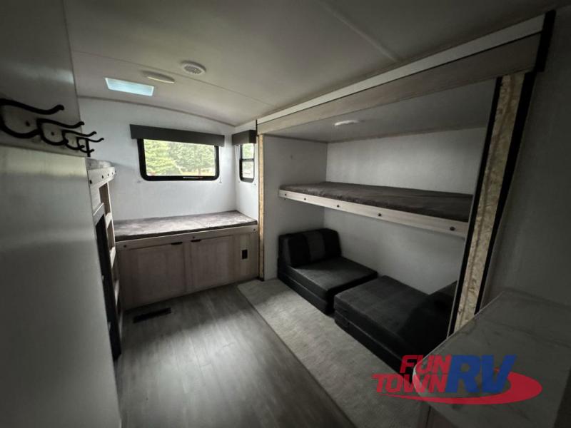 Dual entry doors are just one of the many conveniences you will love about this travel trailer! The rear private bunkhouse has a bunk above an entertainment center, another bunk bed, and a flip-up bunk above a folding futon. The front private bedroom offers a comfortable place for you to get a good night's rest on the queen bed. After a fun day at the beach, you can relax at the sofa and booth dinette slide while the chef prepares dinner with the three burner cooktop or everyone can head outdoors for the chef to cook at the outside kitchen. The full bathroom has a full shower to freshen up in and an entrance/exit door so you can get back to having fun fast!
