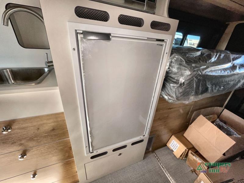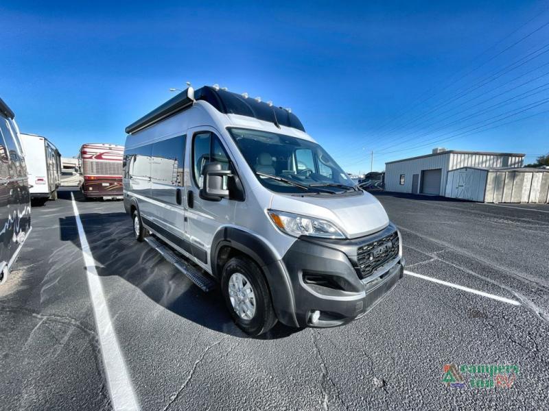 The Airstream Rangeline offers complete comfort and flexibility with great living spaces, flexible storage throughout, and all the amenities you need to enjoy travel. Its sleek design with painted grille, two interior color choices with Warm River Oak cabinets and drawers, and gray laminate countertops allows you to travel in style. The Ram ProMaster 3500 chassis offers front-wheel drive and 276 horsepower, with an efficient gas-powered heat and hot water system plus SumoSprings and SuperSprings for an overall better driving experience. Rear storage includes MOLLE panels on the rear doors to hang all your gear, and space under the bed for even more cargo. The optional pop-top roof has three screen windows and another bed, expanding sleeping capacity to four people.