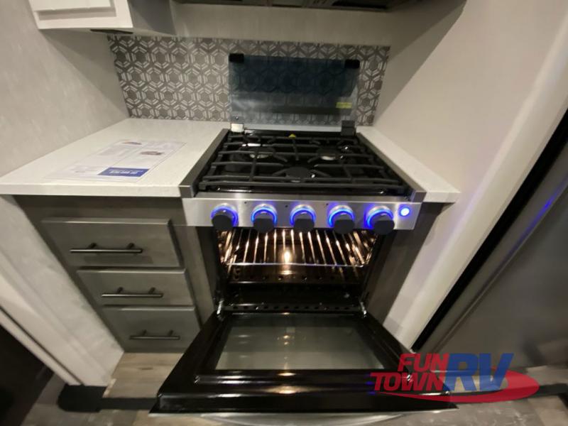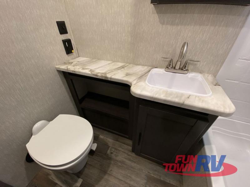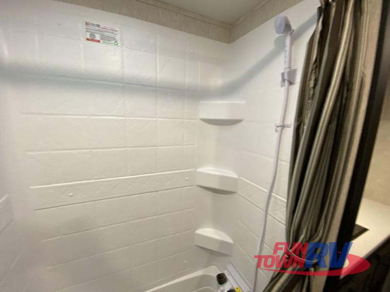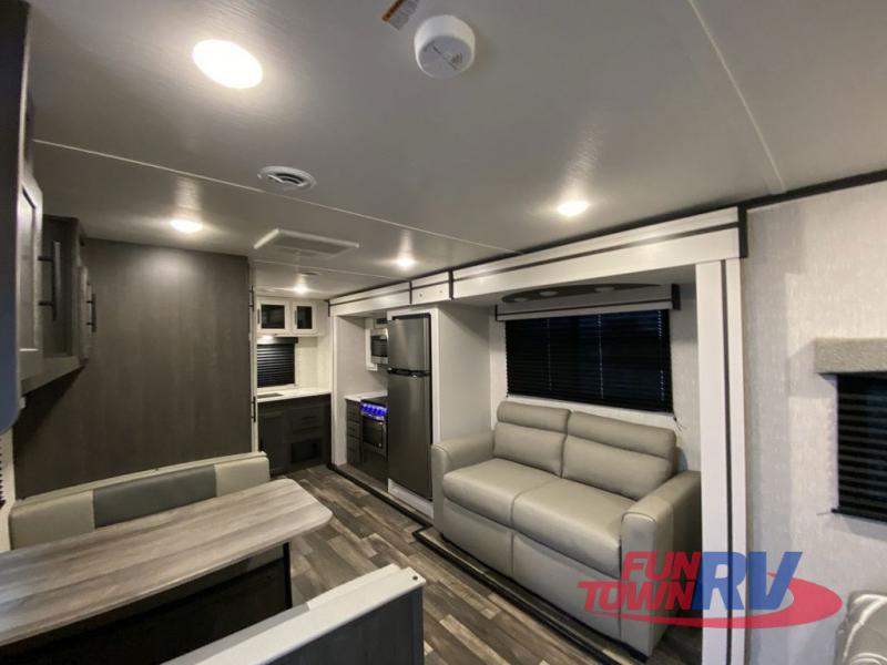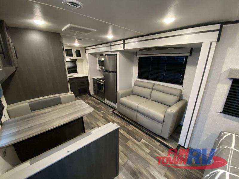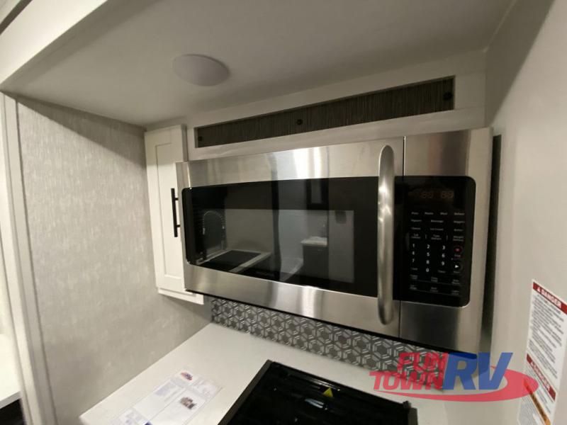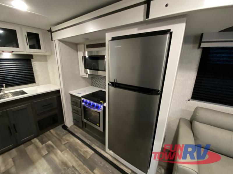 You'll love the kitchen in this travel trailer! The rear corner layout makes great use of the floor space, while including every appliance you might need, including an 11 cu. ft. refrigerator, microwave, and 21" gas oven. Enjoy those meals on the booth dinette, which is located across from the trifold sofa for easy socializing. If you don't need the sofa, you might swap it for the optional power theater seats. The front bedroom features a king bed, dual wardrobes, and additional overhead storage so you have room to bring everything you need. There's also a rear corner bath with a 40" tub and a sliding door to also help use the space more efficiently.