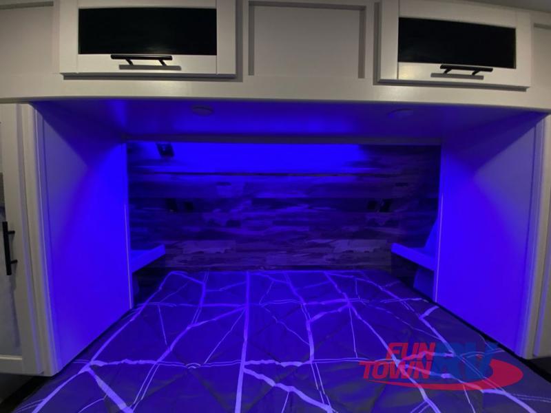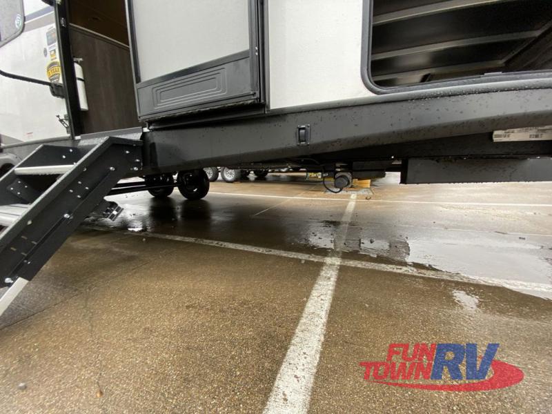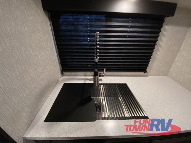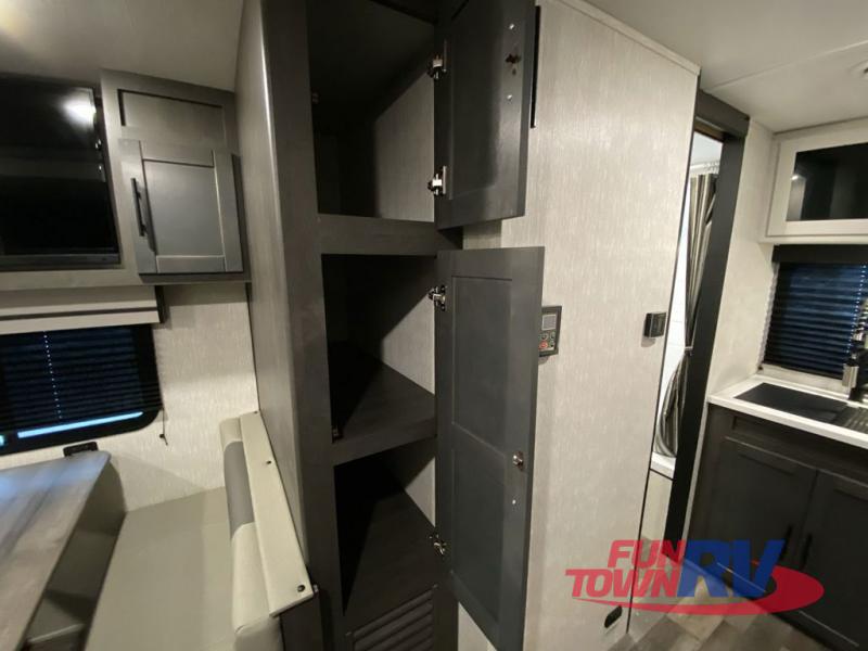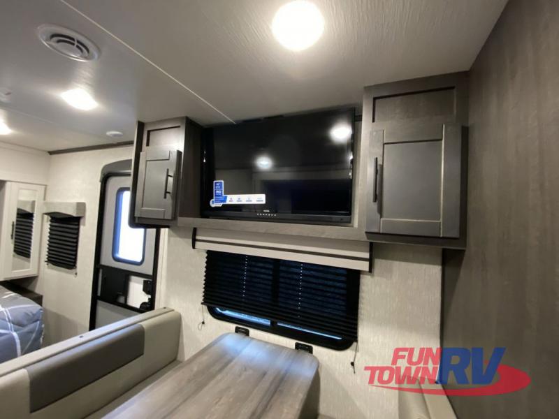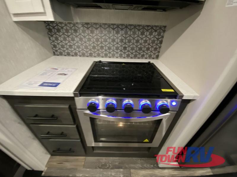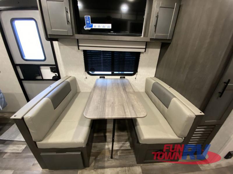 You'll love the kitchen in this travel trailer! The rear corner layout makes great use of the floor space, while including every appliance you might need, including an 11 cu. ft. refrigerator, microwave, and 21" gas oven. Enjoy those meals on the booth dinette, which is located across from the trifold sofa for easy socializing. If you don't need the sofa, you might swap it for the optional power theater seats. The front bedroom features a king bed, dual wardrobes, and additional overhead storage so you have room to bring everything you need. There's also a rear corner bath with a 40" tub and a sliding door to also help use the space more efficiently.