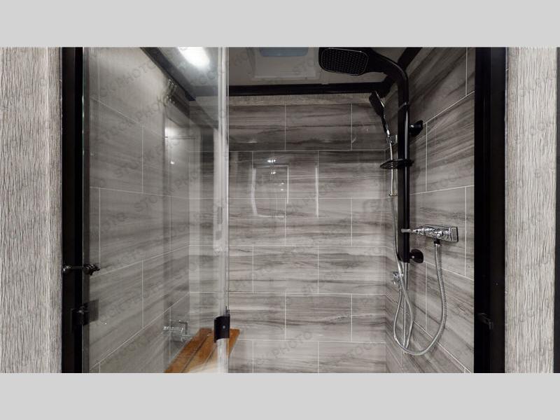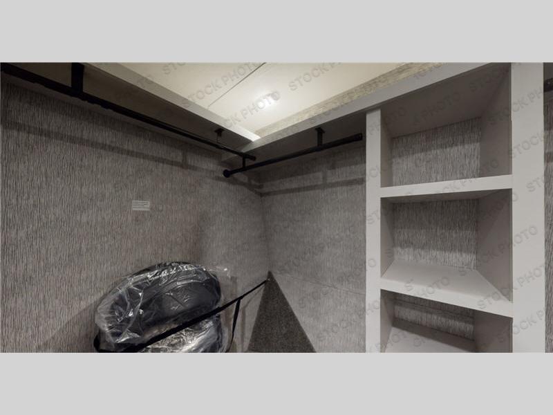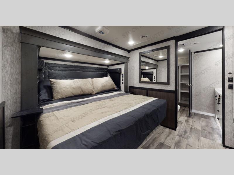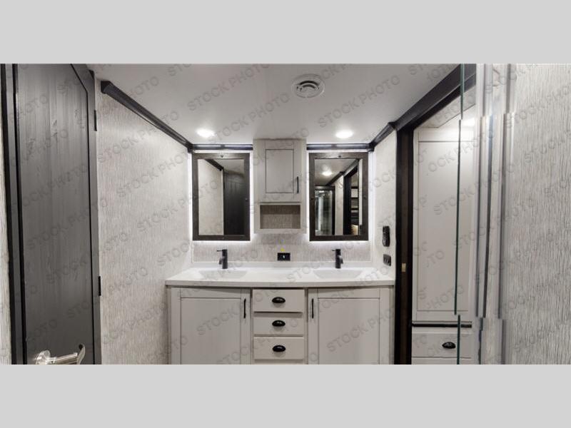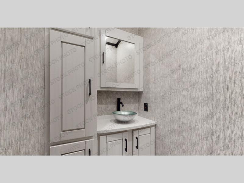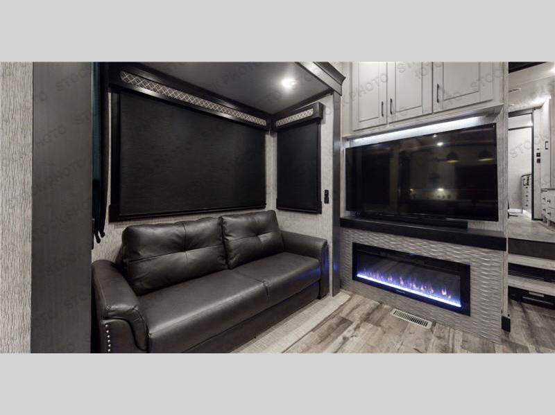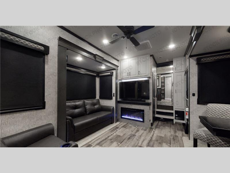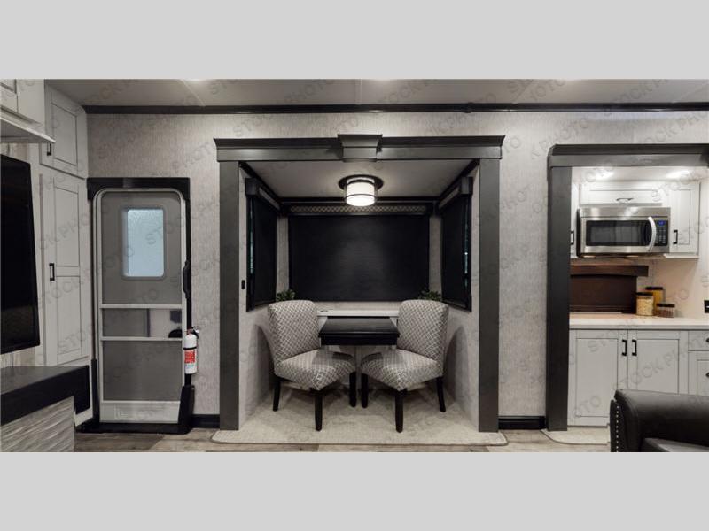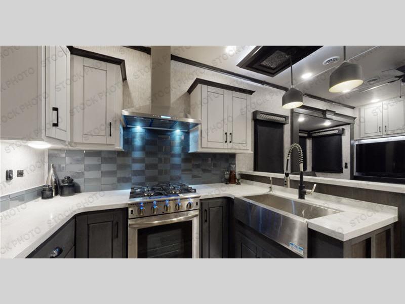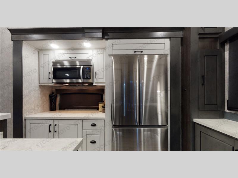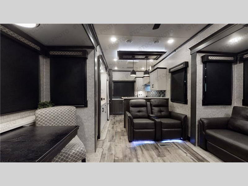 One step inside this fifth wheel and you'll see why it's an award-winning most-popular unit! You'll love the rear kitchen that includes ample countertop for food prep and a slide including the refrigerator, pantry and microwave for added moving around space. Head to the main living area where you can enjoy some family time on the theater seats, and the dinette with chairs will be the perfect place for a game of cards. The half bath is right off of this room for convenience, and your guests or kids can convert the tri-fold sofa into a bed for sleeping space at night. You will love the master bedroom with a king bed slide out, a dresser with a flip-up lid, plus a 39" TV. The front full bath is super spacious, and it includes a large walk-in wardrobe where you can even add an optional washer and dryer if you choose!