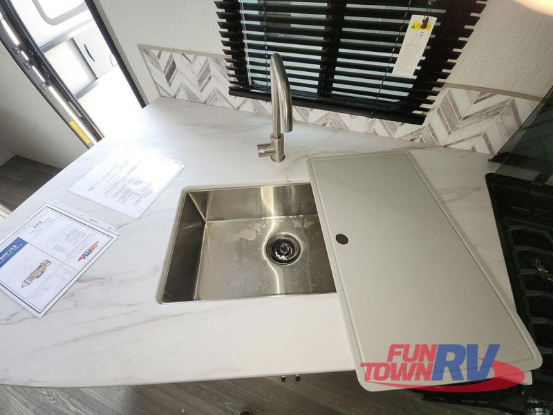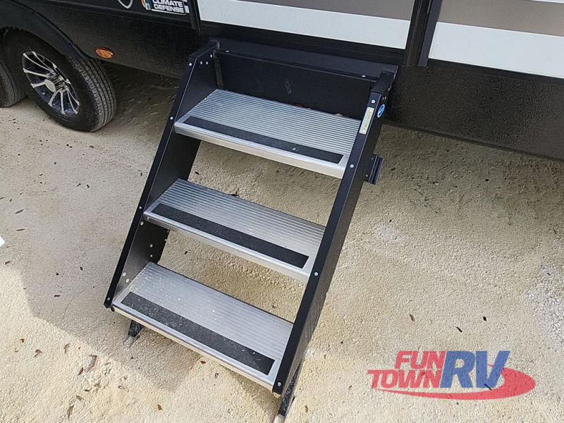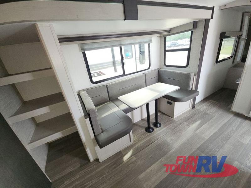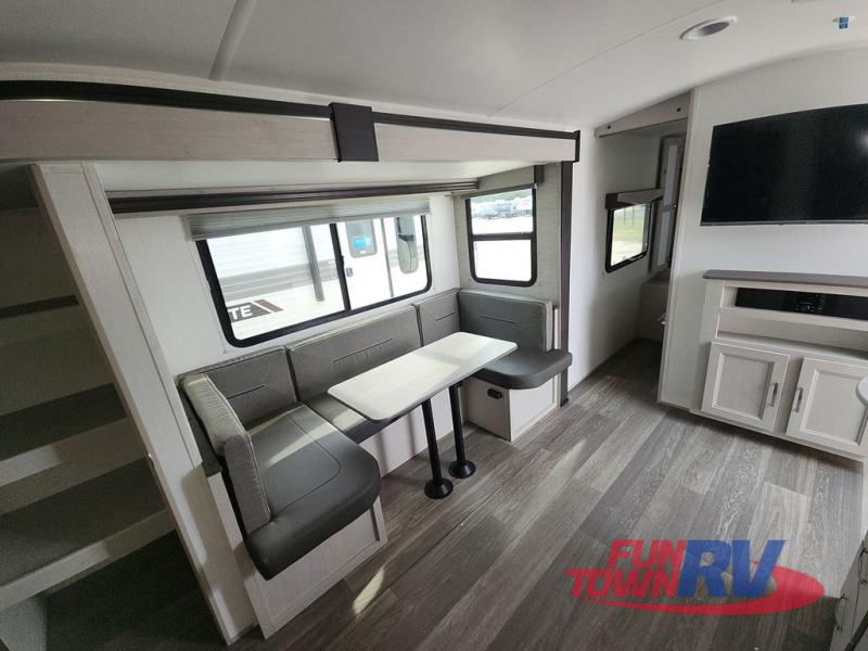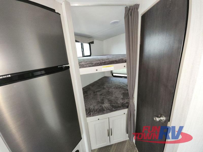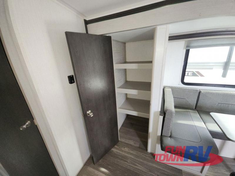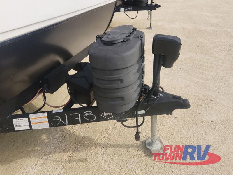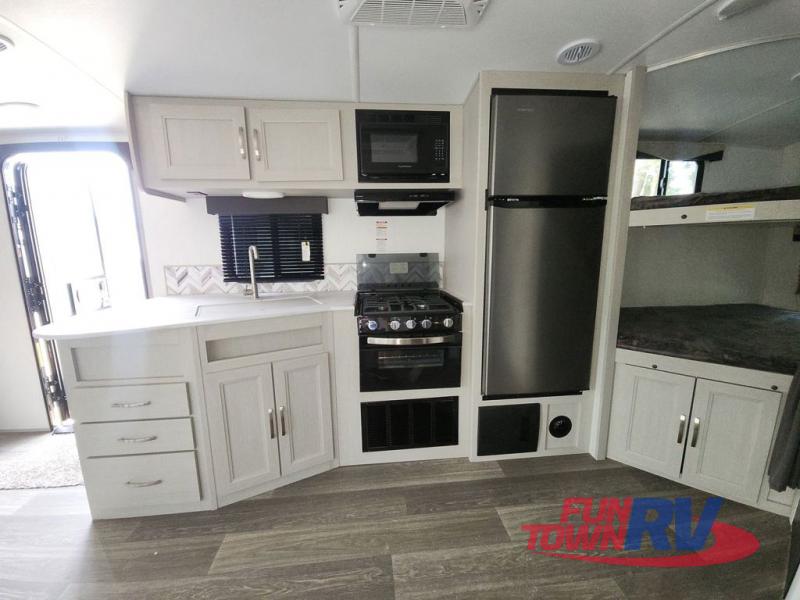 There is so much to love about this travel trailer, so come take a look! Since there are double-size bunks, a U-shaped dinette, and a queen bed in the front private bedroom, you can comfortably sleep eight happy campers! Once you've prepared dinner on the three burner range with an oven, everyone can dine around the dinette or sit outdoors under the 20' awning. There is also an outdoor kitchen with a griddle so you can cook outside on a nice day!