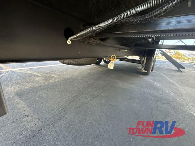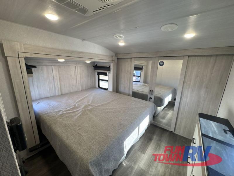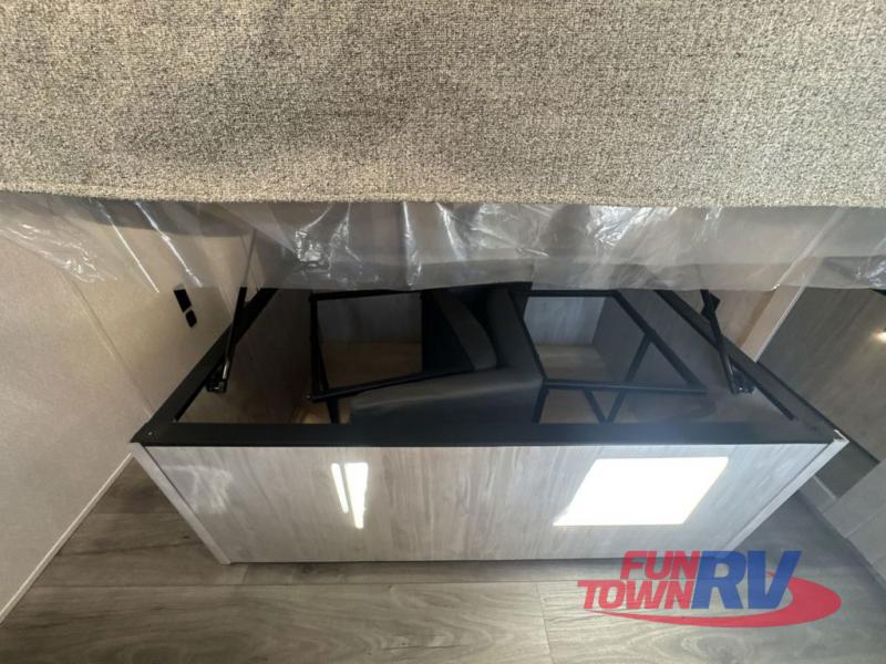 Roughing it in the woods will hardly feel like roughing it in this cozy fifth wheel for six! You'll have a full kitchen to cook in each day that includes a four burner range with a 30" over-the-range microwave, ample counter space to prep meals, and a 16 cu. ft. 12V refrigerator that will hold food for the whole week. There is also a free-standing adjustable dinette here with a storage ottoman and a counter that overlooks the rear living area. Here, you'll enjoy two hide-a-bed sofas and theater seating across from the fireplace and 50" TV. And this room can double as your guests' bedroom at night! You'll be able to claim the front private bedroom with a king bed slide out, a full-length wardrobe with washer and dryer prep, plus a dresser with TV prep if you want to add a TV.