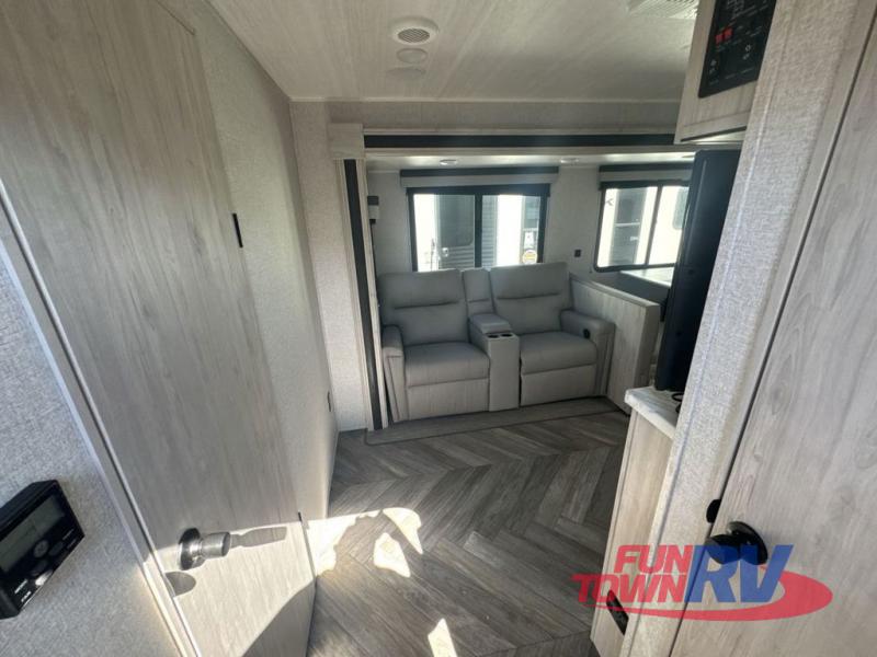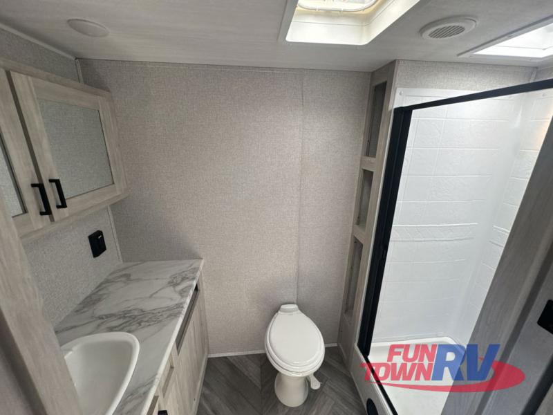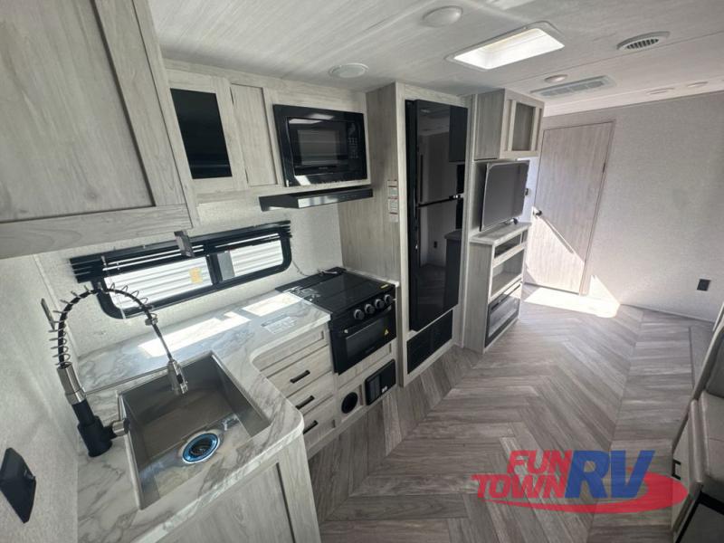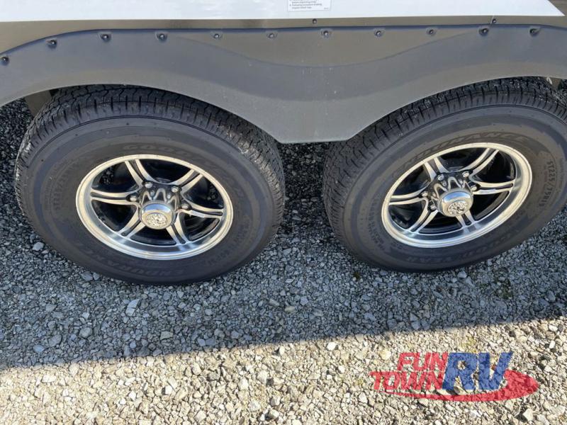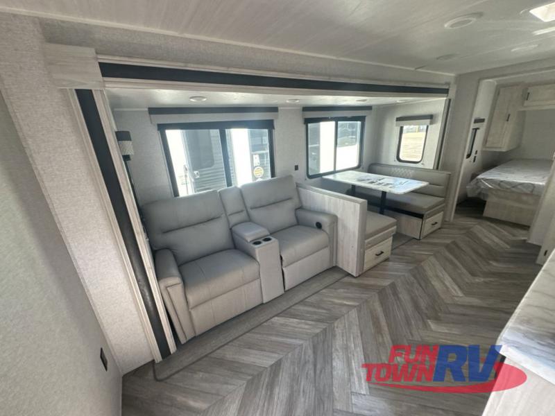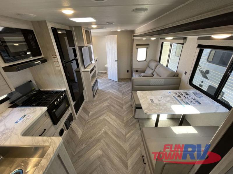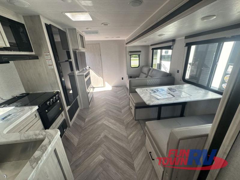 When you are wanting a little more interior space in your next travel trailer, take a look inside! This large slide out widens the center so you can easily make meals using full amenities without having to move for someone walking from the front private bedroom to the rear spacious bathroom. There is a king-size bed with storage on both sides, underneath and above, plus a space saving sliding door. The oversized booth dinette and jack knife sofa offer comfortable seating as well as extra sleeping space for overnight guests. And the fireplace is just a nice feature to enjoy. And the large pantry is a convenient feature you will surely appreciate. There is so much more!