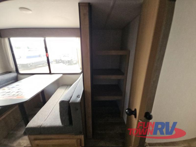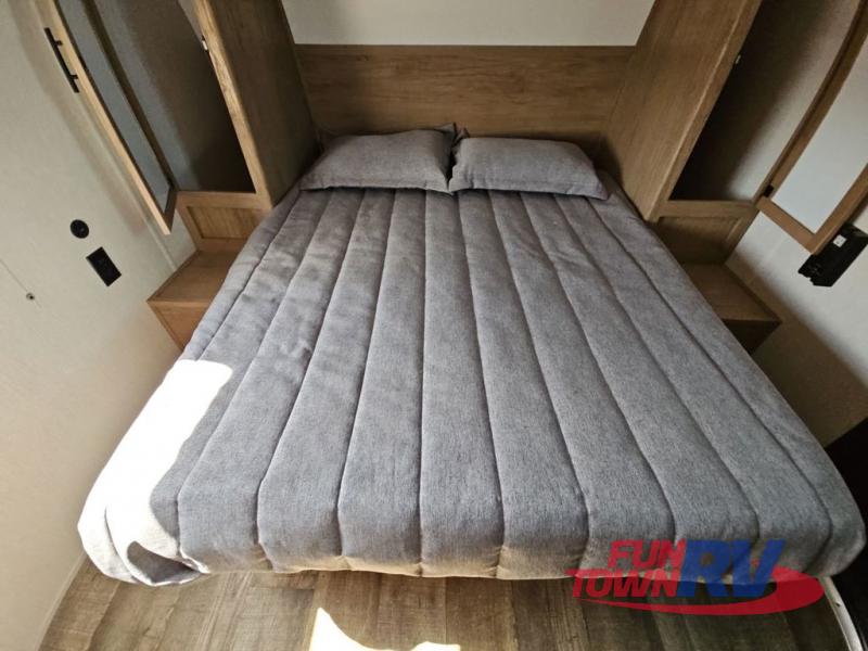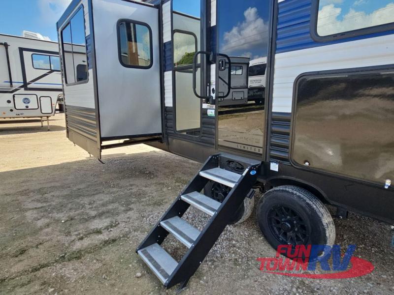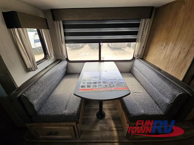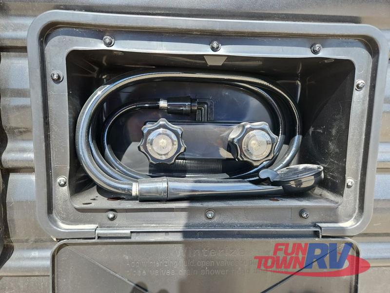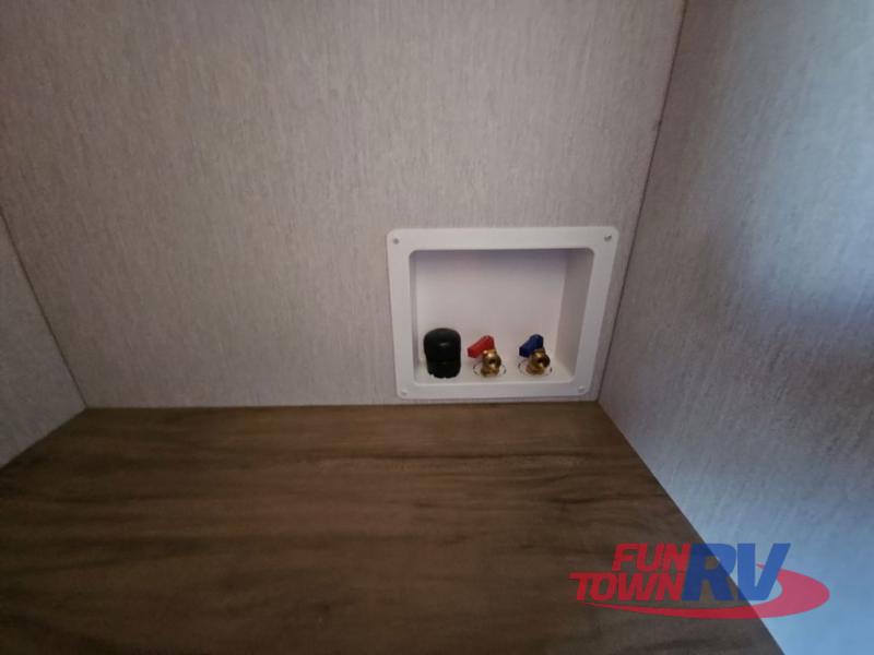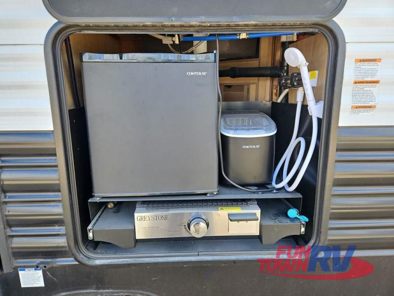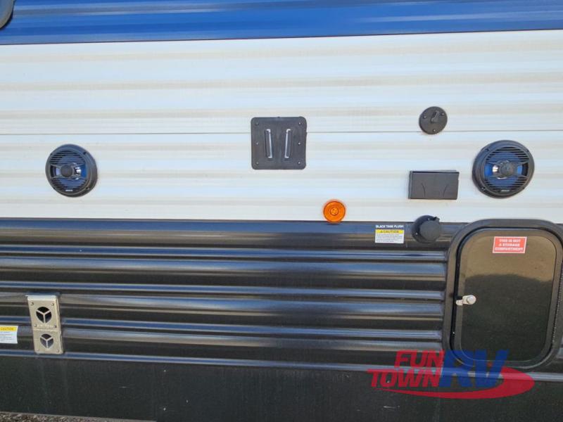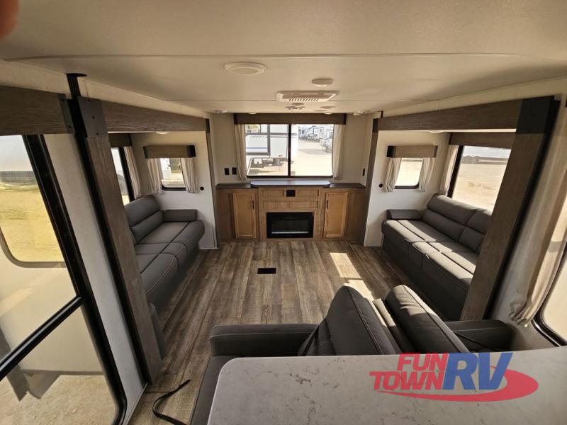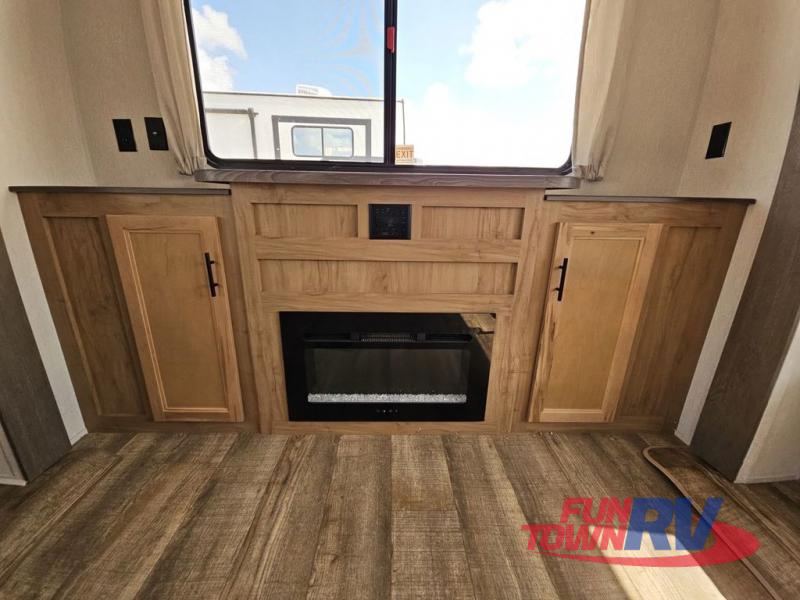 Affordable luxury and livability is what you will find in this travel trailer! The rear living area has opposing sofa slides, two recliners, a rear entertainment center with a fireplace, and panoramic windows for added natural lighting. There is even a bar top with two bar stools overlooking the living area so you can enjoy a meal and a movie. The booth dinette slide has a full door pantry next to it so you can quickly grab a snack during game night. Freshen up each morning in the full bathroom with the shower with a seat. The front private bedroom has a walk around queen bed for a good night's rest and a linen closet with an area prepped to add the optional washer and dryer. You even have an outside kitchen, a rear storage rack, outside storage areas, and an outside TV mount!