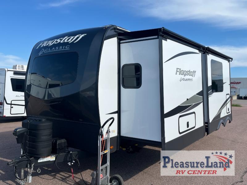 Each one of these Forest River Flagstaff Classic fifth wheels or travel trailers will be your home on wheels! Their quality craftsmanship and attention to detail shines through the surface-coated steel I-beam frame on fifth wheels, the enclosed underbelly, the radius roof with vaulted interior ceilings, and six-sided fully aluminum-framed floor, walls, and roof. Towing your unit will be easy with the torsion axle, Rubber-Ryde suspension, and nitrogen-filled Goodyear Endurance tires. You will even reduce your use of water with the Showermiser water saving system in the bathroom. A few other convenient features you will enjoy include a control panel with WeRV app control, a designer headboard and bedding, and an outside shower with hot and cold water. Come choose your favorite one today!