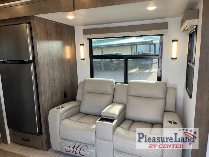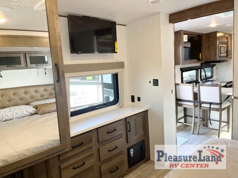 A perfect couples coach to get away featuring dual slides for added interior space. The main entry leads into a combined kitchen and living room providing an L-shaped counter with two-person bar top seating! This is a great place to enjoy your meals and morning coffee inside. Your nights will be spent in true relaxation with the 67" theater seating to watch TV, and a king bed slide in the front bedroom for a great night's rest. The full rear bathroom features a shower with a seat plus overhead skylight, and linen storage. You can also choose to cook outdoors when you have an outside kitchen and griddle, plus a 22' awning. This creates a nice outdoor living area that is perfect both day and night!