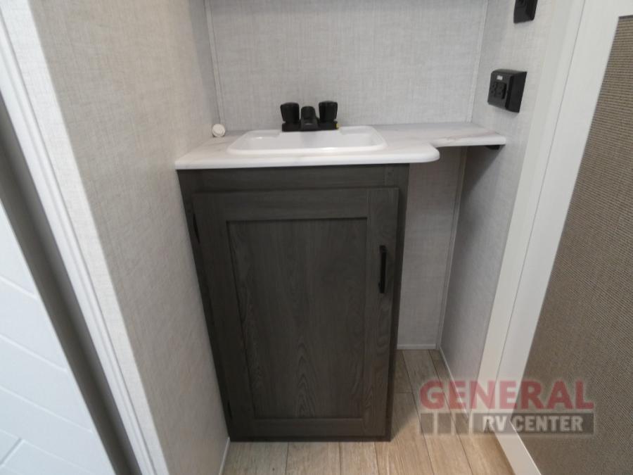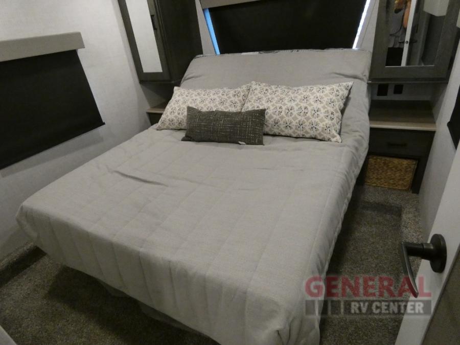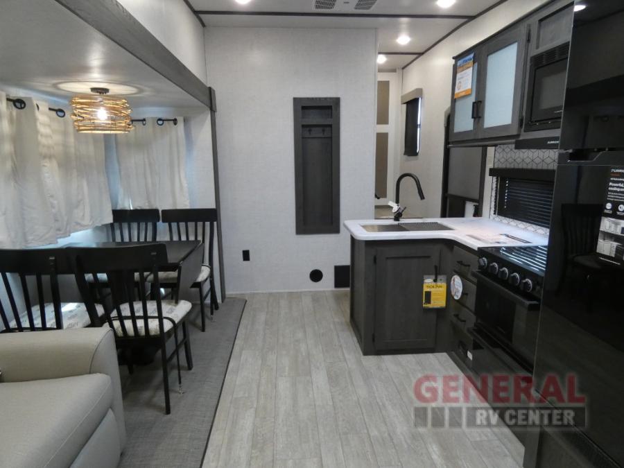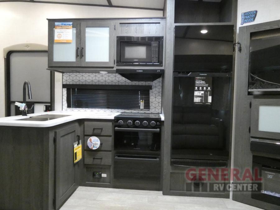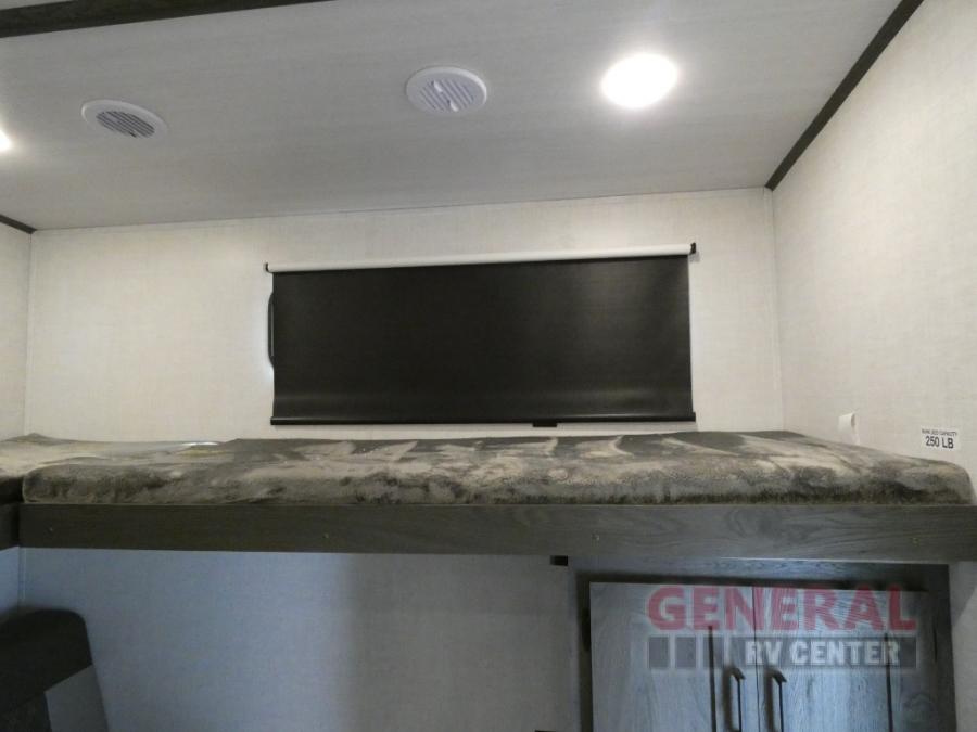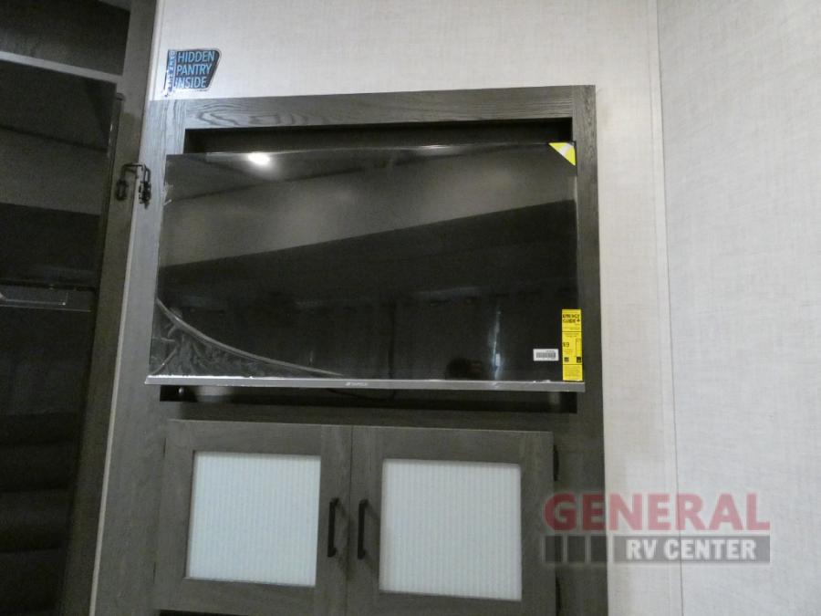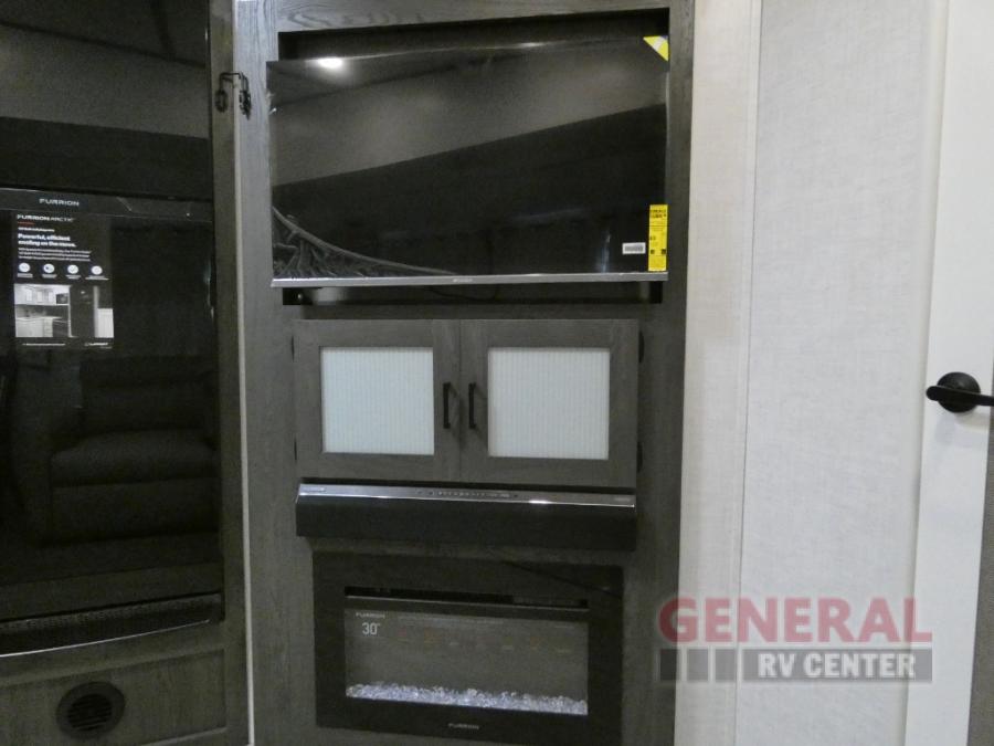 This fifth wheel is going to make an impression on anyone that steps foot inside or walks around the outside! From having a second entry/exit door into the rear bunkhouse and a main entry into the living and kitchen area, plus having an outside kitchen to make meals in the great outdoors, nobody will ever want to go home! The rear bunkhouse also includes a Versa queen bed plus two flip-down upper bunks, plus storage. The front bedroom gives you privacy from everyone and there is a walk-around queen bed with Versa Tilt technology, three wardrobes and a space prepped for a washer/dryer option. The full bathroom will keep everyone refreshed, and the inside kitchen has full amenities including an L-shaped counter. There is hidden storage behind the LED TV with fireplace below.