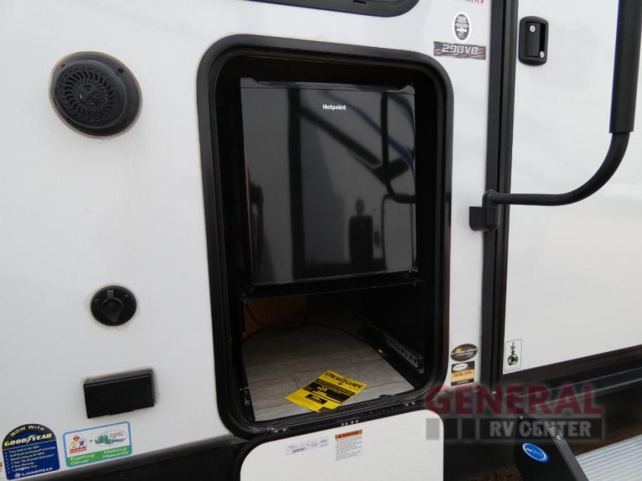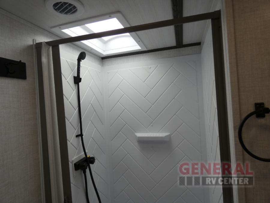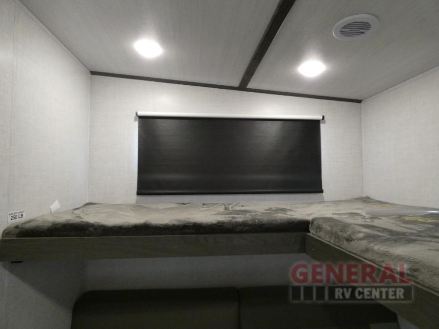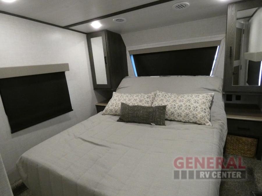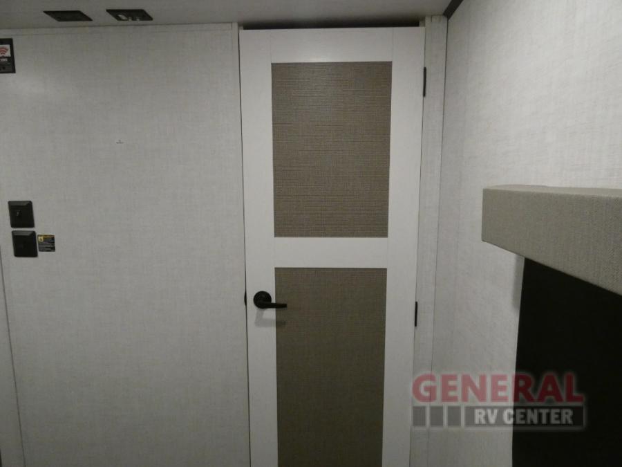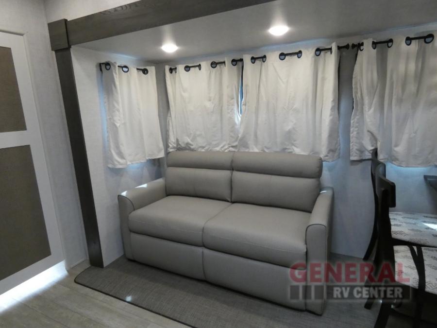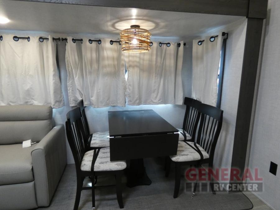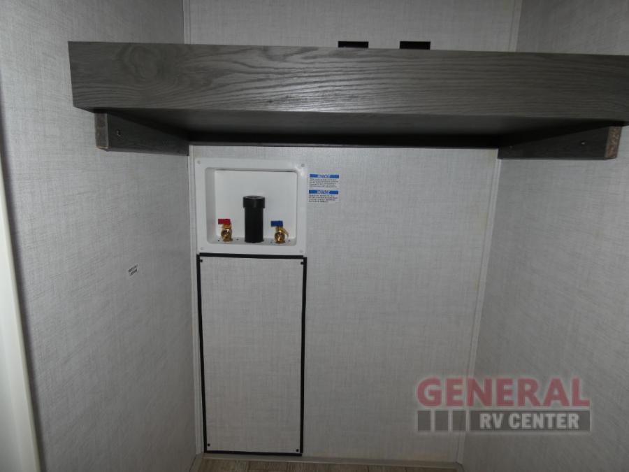 This fifth wheel is going to make an impression on anyone that steps foot inside or walks around the outside! From having a second entry/exit door into the rear bunkhouse and a main entry into the living and kitchen area, plus having an outside kitchen to make meals in the great outdoors, nobody will ever want to go home! The rear bunkhouse also includes a Versa queen bed plus two flip-down upper bunks, plus storage. The front bedroom gives you privacy from everyone and there is a walk-around queen bed with Versa Tilt technology, three wardrobes and a space prepped for a washer/dryer option. The full bathroom will keep everyone refreshed, and the inside kitchen has full amenities including an L-shaped counter. There is hidden storage behind the LED TV with fireplace below.