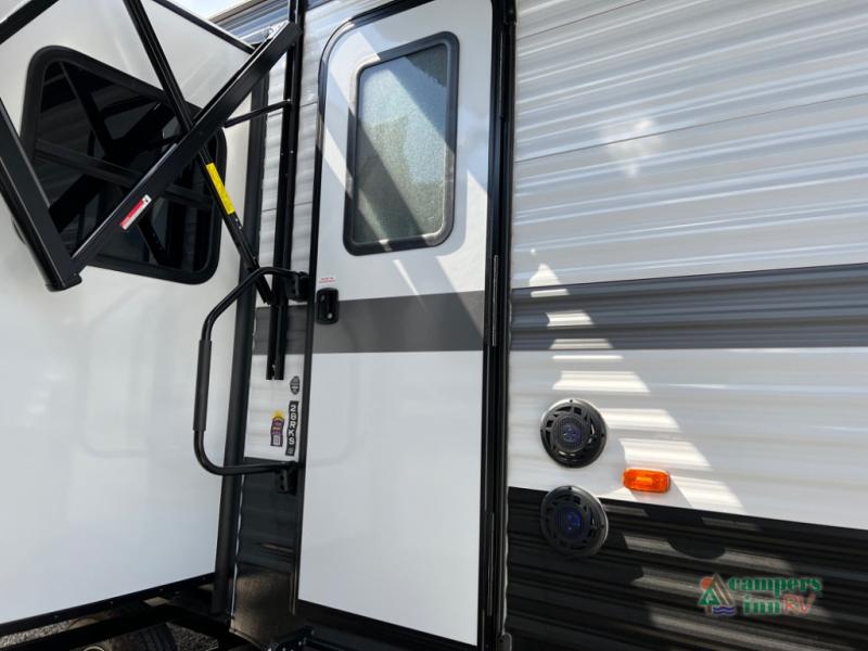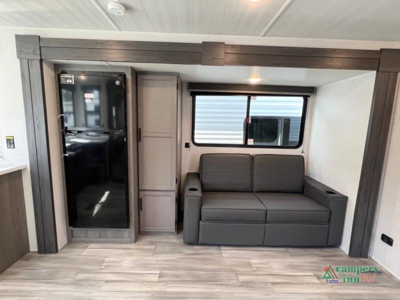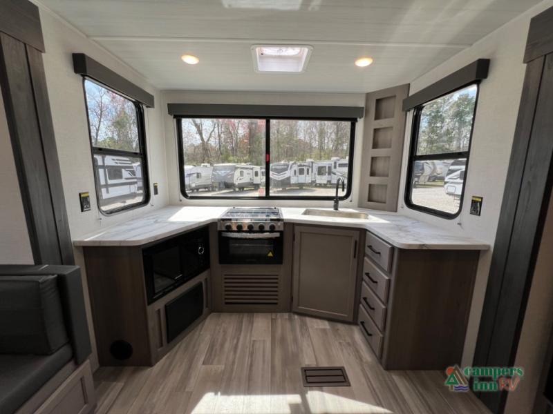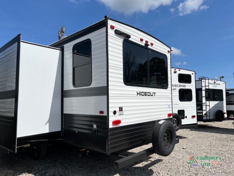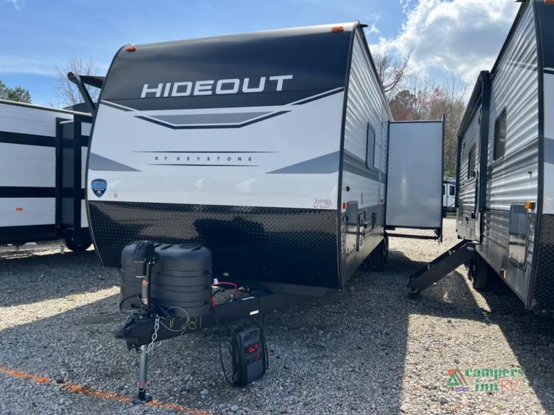 Experience spacious, comfortable camping with the Keystone Hideout 28RKD Travel Trailer. This rear kitchen layout features dual opposing slides in the living area for maximum space, a walk-around queen bed in the private front bedroom, and a convenient walk-through bathroom accessible from both the bedroom and main living space. With upgraded features inside and out, this travel trailer is built for comfort, style, and extended camping adventures.