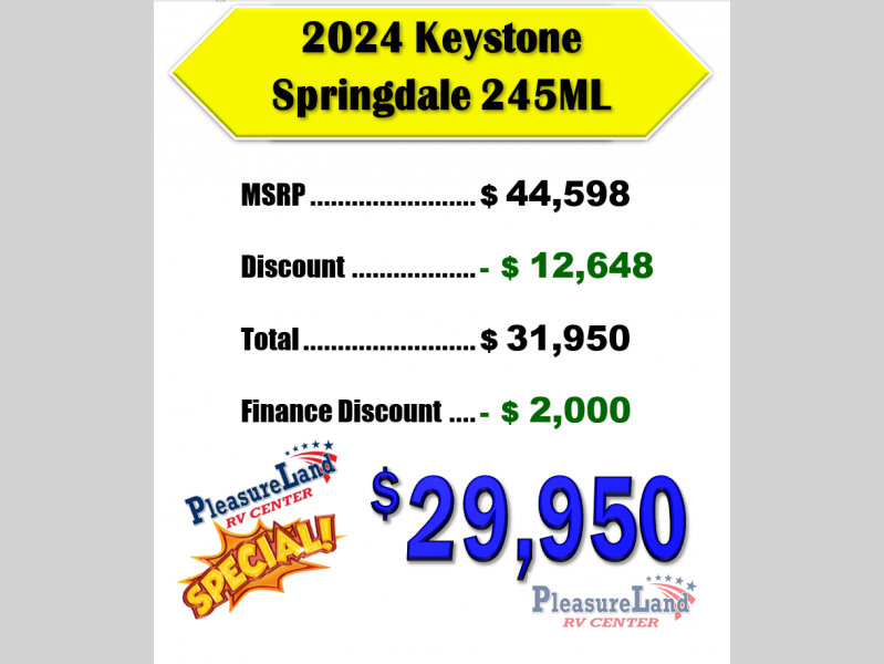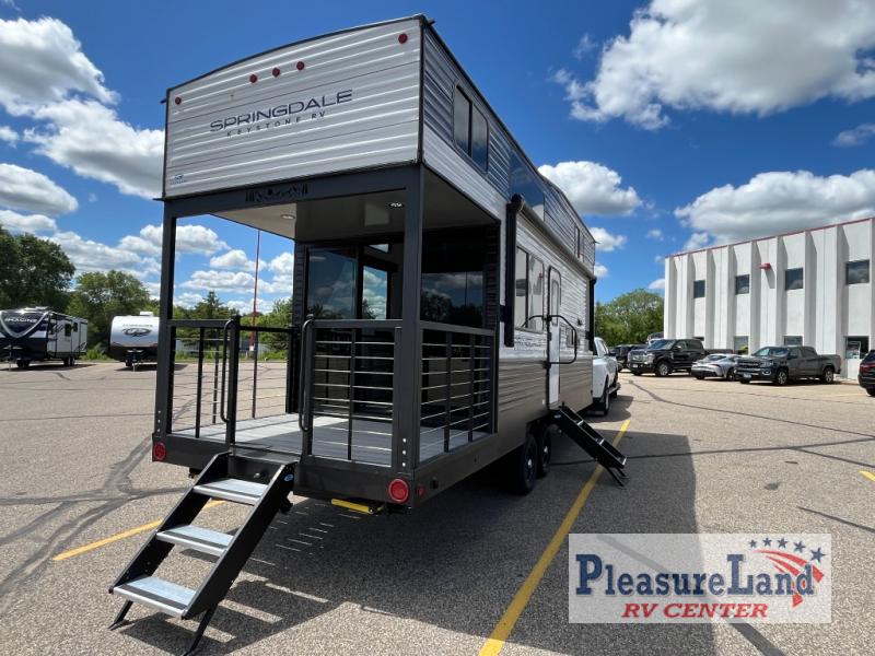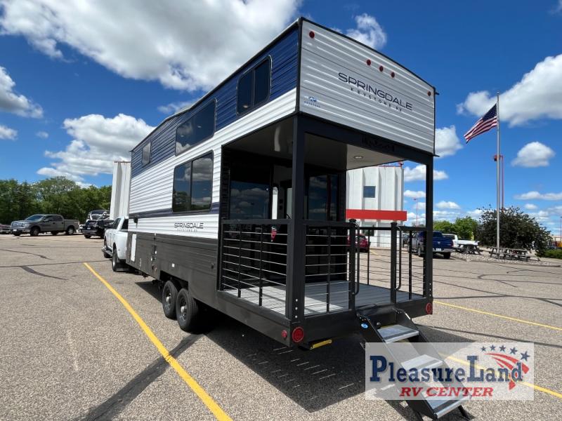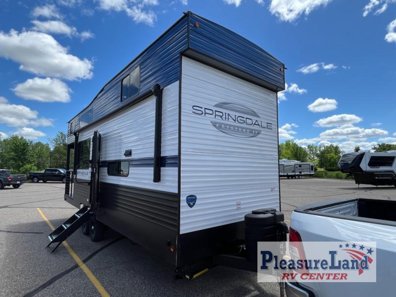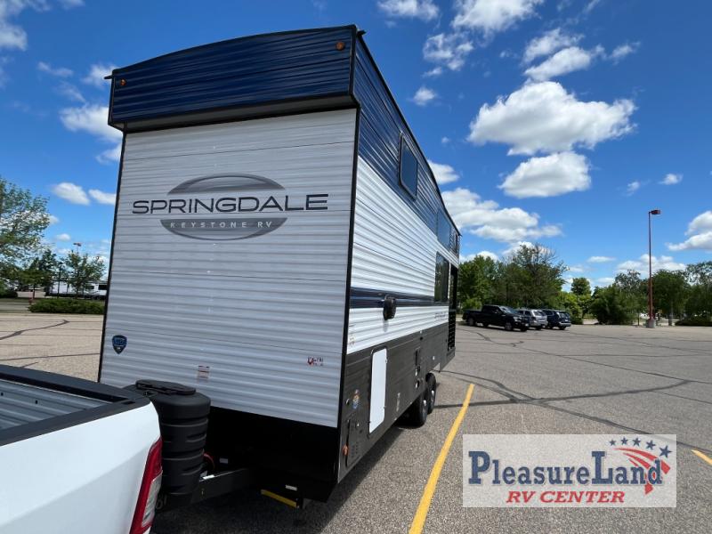 With any Springdale travel trailer by Keystone you will enjoy convenient amenities and comfortable camping features at every turn. The aluminum exterior will be easy to clean, and the power awning provides protection against the hot summer sun. There is also an exterior shower, a friction hinge entry door, and an XL entry assist handle to safely enter and exit the unit. You will find many comforts inside, including a stainless steel sink, ample storage space for your belongings, and cozy sleeping spaces. Start a new adventure today in a Springdale travel trailer!