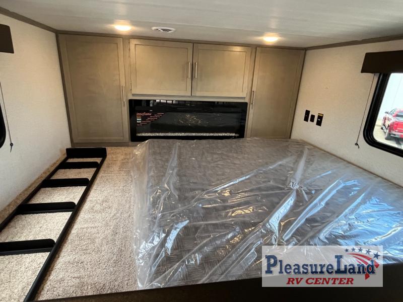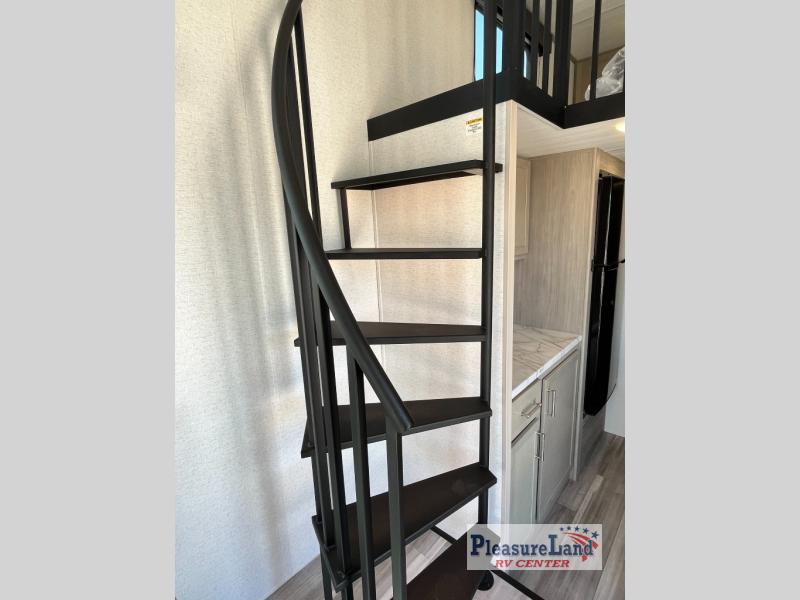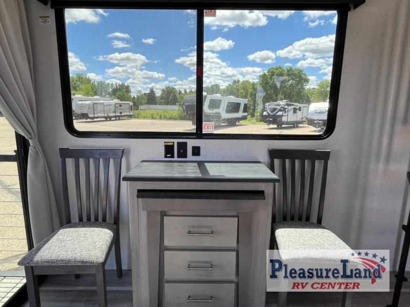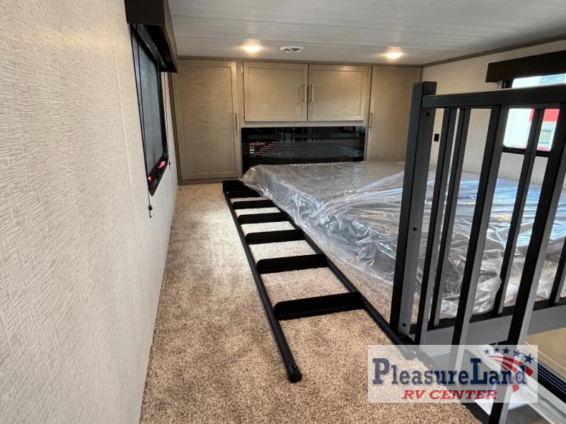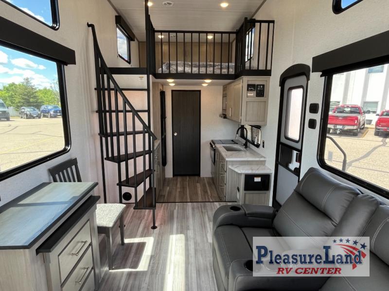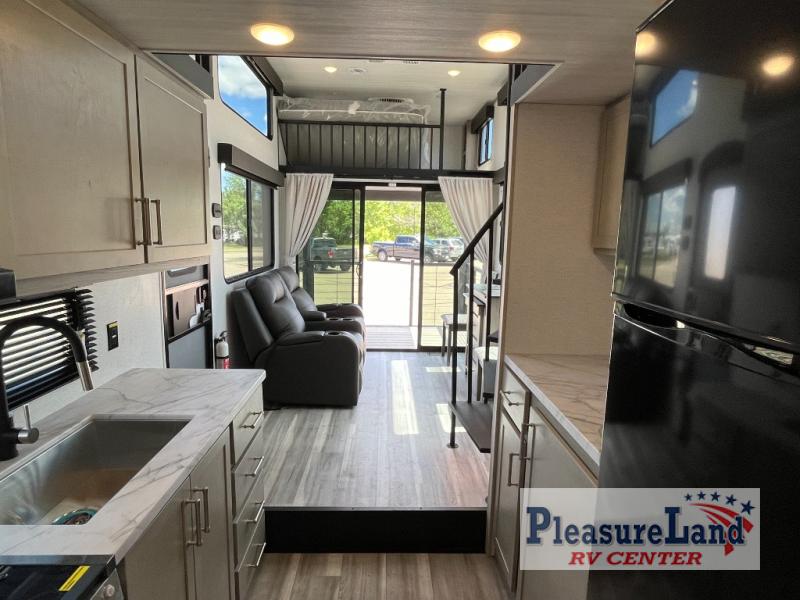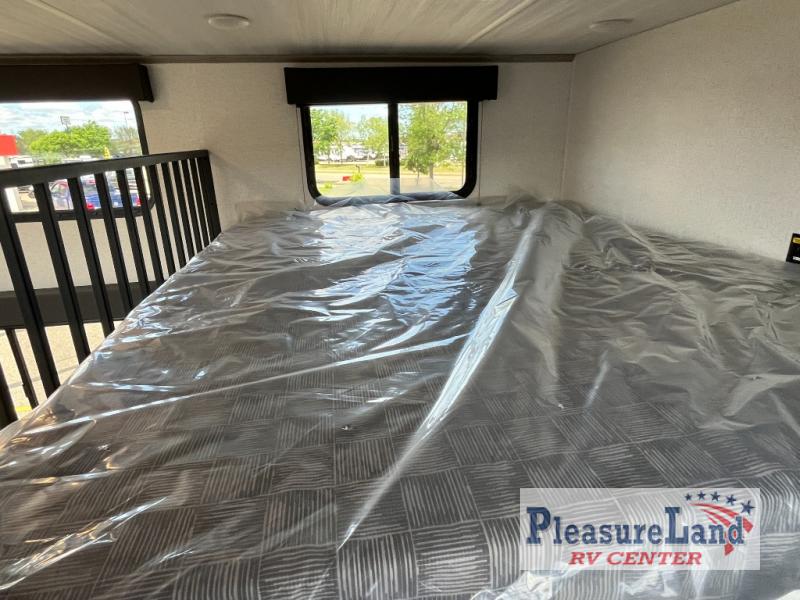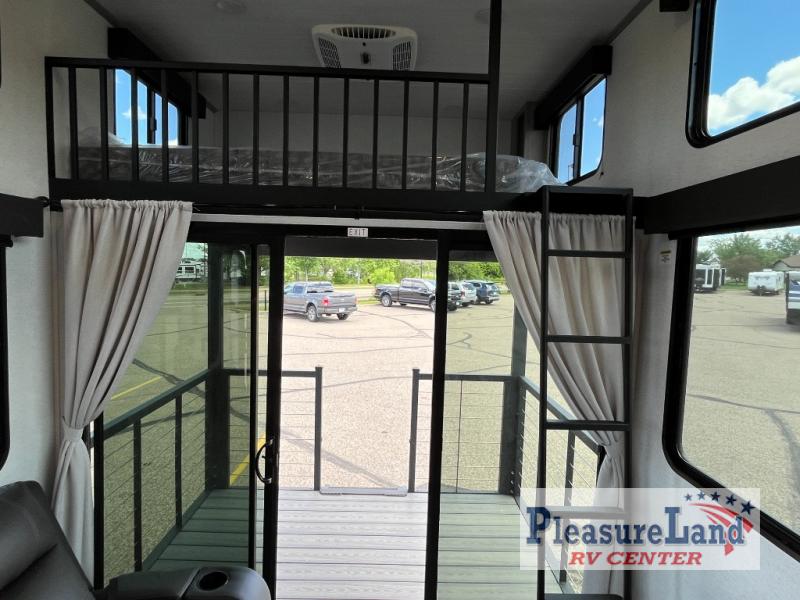 Any amount of time in this travel trailer will be time well spent! The rear entry door leads to the covered porch with a loft area above and queen-size bed. The patio door leads into the main living area where you can enjoy the sofa or dual lounge chairs with a pull-out table. Once you head to the front of this unit, you'll find the full kitchen with a three burner gas cooktop and 17" oven to cook meals on each day. There is also a pantry and 10 cu. ft. 12V refrigerator for food storage. The front full bath includes a shower with a seat, a toilet, sink, and a linen closet to keep clean towels close by. There is even a second loft above the kitchen and bath where you'll find a second queen-size bed and storage space for your things; how convenient!