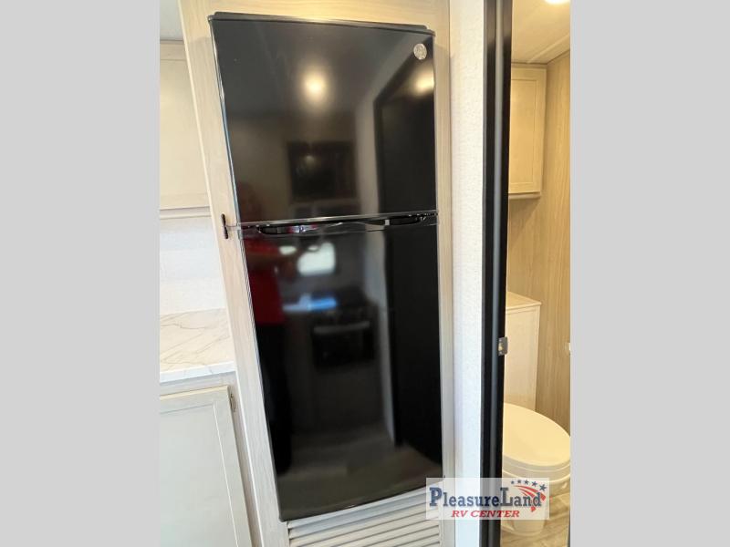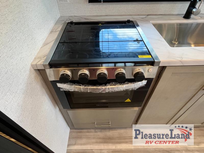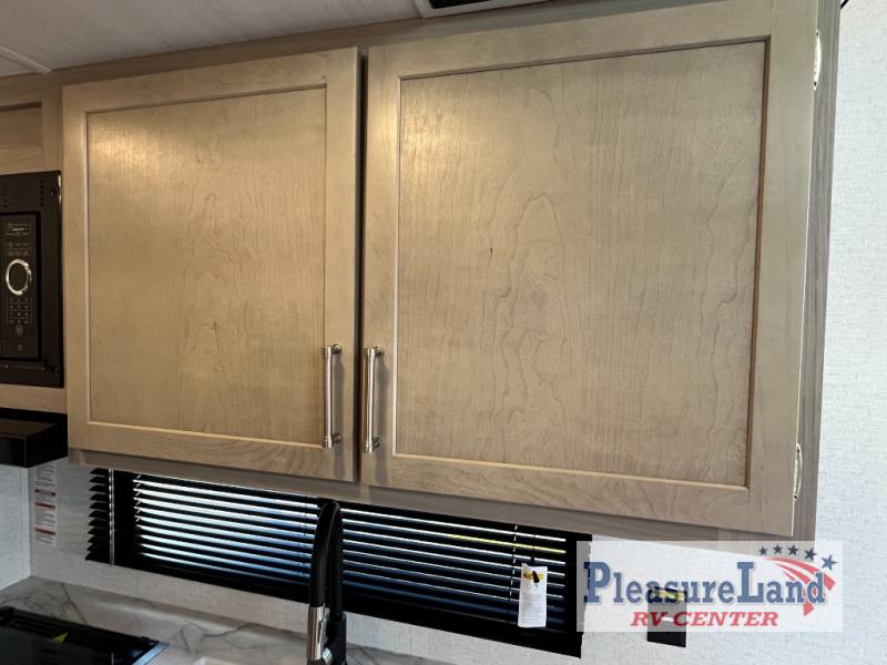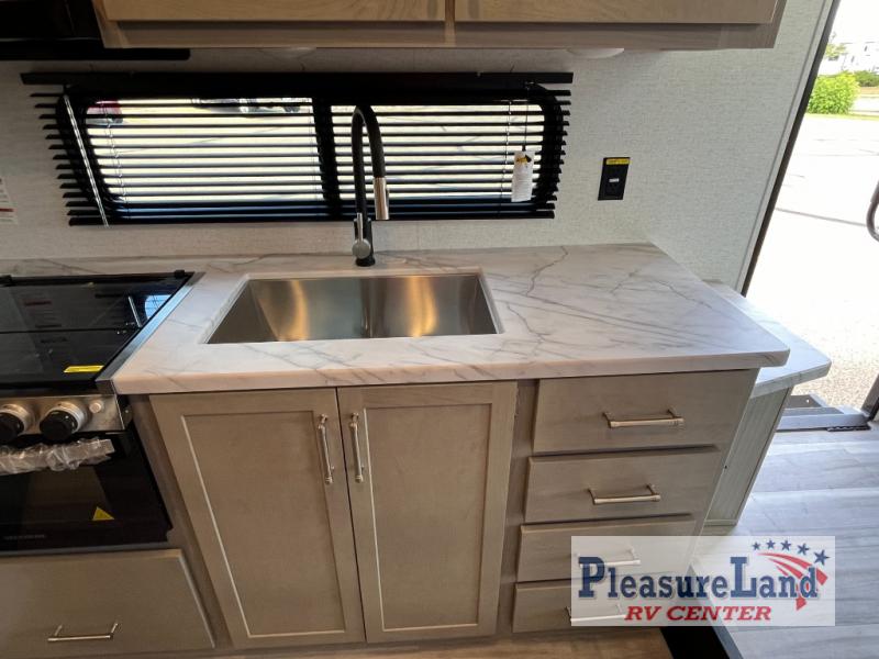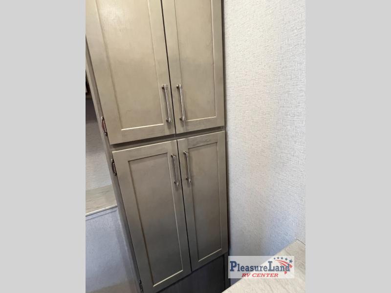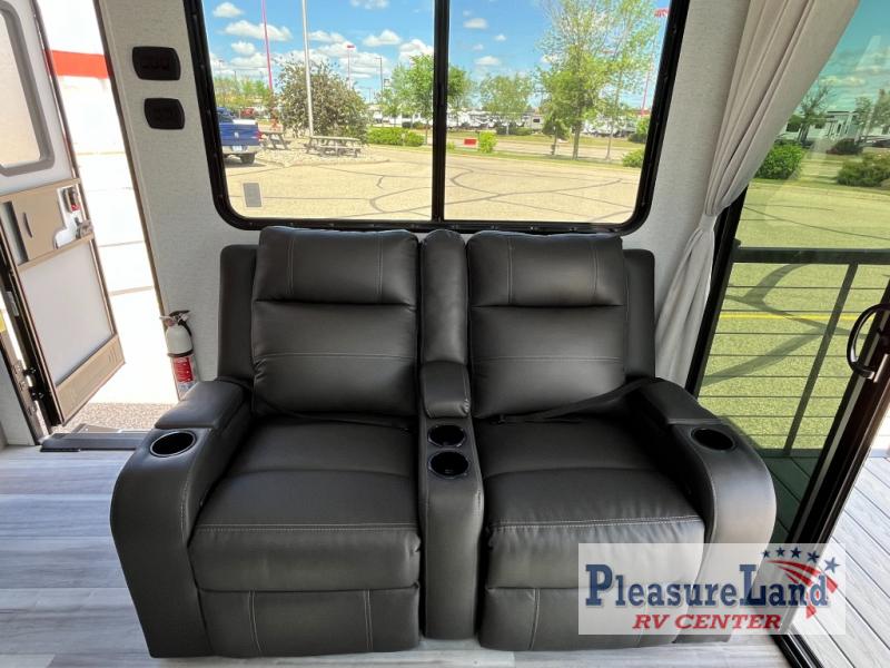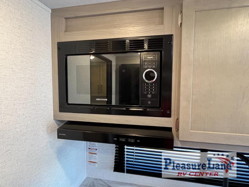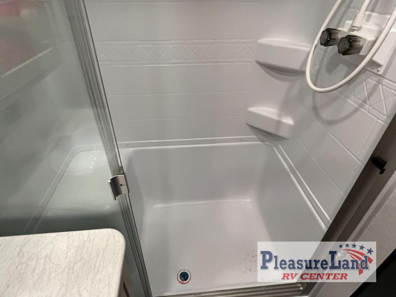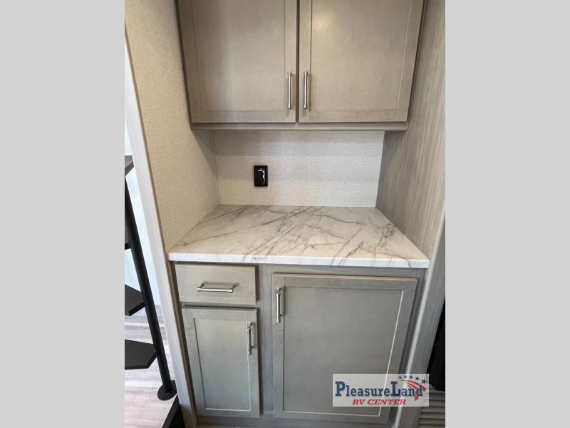 Any amount of time in this travel trailer will be time well spent! The rear entry door leads to the covered porch with a loft area above and queen-size bed. The patio door leads into the main living area where you can enjoy the sofa or dual lounge chairs with a pull-out table. Once you head to the front of this unit, you'll find the full kitchen with a three burner gas cooktop and 17" oven to cook meals on each day. There is also a pantry and 10 cu. ft. 12V refrigerator for food storage. The front full bath includes a shower with a seat, a toilet, sink, and a linen closet to keep clean towels close by. There is even a second loft above the kitchen and bath where you'll find a second queen-size bed and storage space for your things; how convenient!