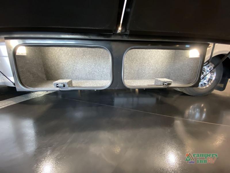 Get ready to explore, unwind and "glamp" where ever you decide! This coach brings you everything you will need, plus much much more! The power slide offers a Murphy suite that retracts and fits seamlessly with the luxury automotive body style. With a touch of a button on the multiplex control panel, you will have more floor space to relax on the reclining sofa that includes two seatbelts or pull down the Murphy bed at night. There is more seating on the captain's chairs that swivel around to face the interior, and there are two tables that adjust to different heights for your needs. The kitchen provides a two-burner gas stove and large stainless steel Kohler sink and faucet, and there is a convection microwave, a slide-out pantry and a refrigerator with a freezer a few steps away.