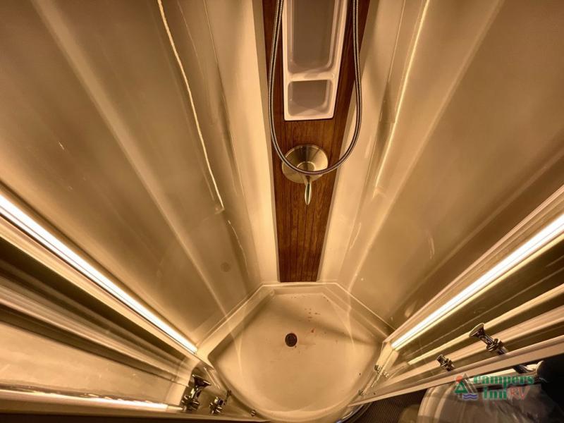 Get ready to explore, unwind and "glamp" where ever you decide! This coach brings you everything you will need, plus much much more! The power slide offers a Murphy suite that retracts and fits seamlessly with the luxury automotive body style. With a touch of a button on the multiplex control panel, you will have more floor space to relax on the reclining sofa that includes two seatbelts or pull down the Murphy bed at night. There is more seating on the captain's chairs that swivel around to face the interior, and there are two tables that adjust to different heights for your needs. The kitchen provides a two-burner gas stove and large stainless steel Kohler sink and faucet, and there is a convection microwave, a slide-out pantry and a refrigerator with a freezer a few steps away.