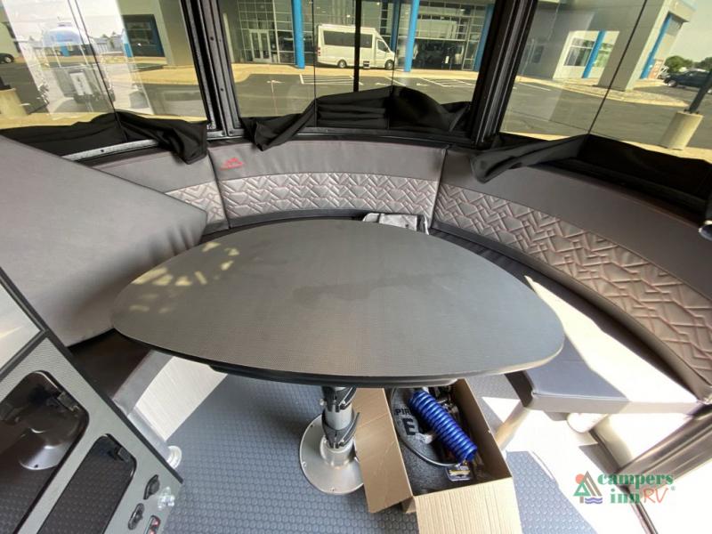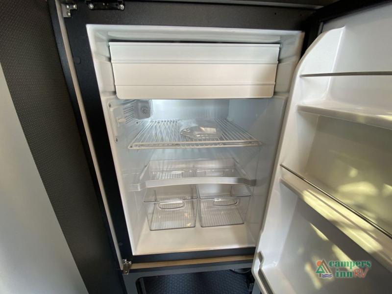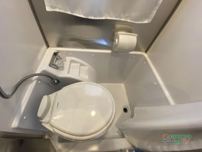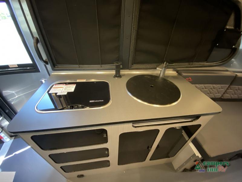 This travel trailer includes the Basecamp X Package that comes with stainless steel front stone guard protection, Goodyear off-road tires, and a 3" lift kit for added ground clearance. You can easily sleep everyone when using both the rear benches and the front U-shaped dinette. The benches provide split sleeping or a half-bed on one side and a full bed that spans the back of the trailer into an 82" x 78" area. There is storage under the cushions for the two removable tables that allow you to dine, work and relax with a place for your cellphones and such. The wet bath comes complete with a shower, sink and toilet so you can rinse off from a day outdoors, the galley kitchen gives the cook a place to make warm meals and store drinks and leftovers. This Basecamp also offers front panoramic windows, a steel entry step, a full-size spare tire, and a rear hatch allowing you to take your snowboards, skis, and paddle boards.