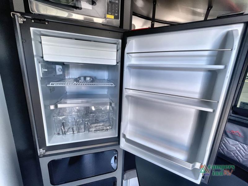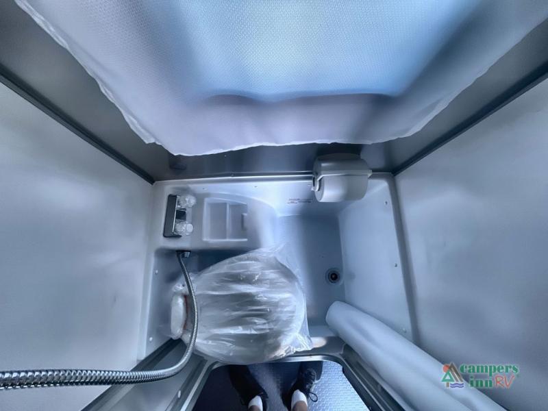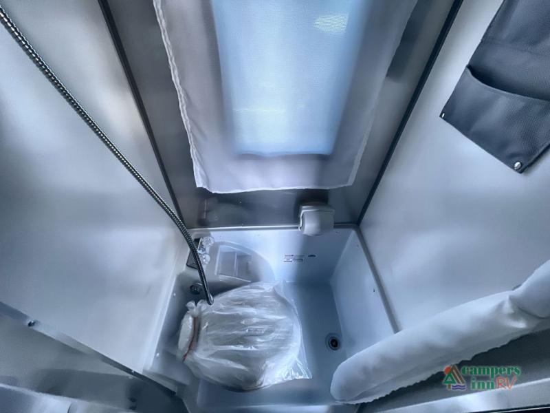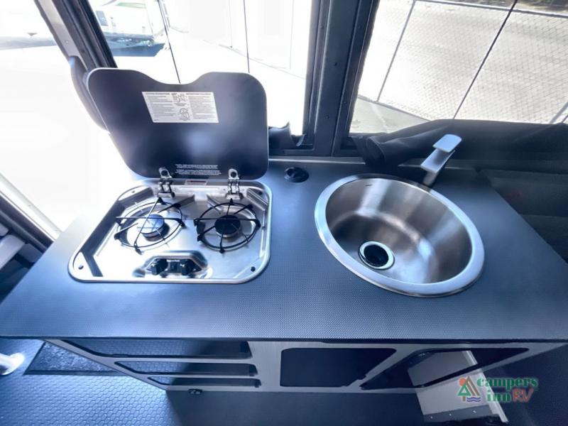 This travel trailer includes the Basecamp X Package that comes with stainless steel front stone guard protection, Goodyear off-road tires, and a 3" lift kit for added ground clearance. You can easily sleep everyone when using both the rear benches and the front U-shaped dinette. The benches provide split sleeping or a half-bed on one side and a full bed that spans the back of the trailer into an 82" x 78" area. There is storage under the cushions for the two removable tables that allow you to dine, work and relax with a place for your cellphones and such. The wet bath comes complete with a shower, sink and toilet so you can rinse off from a day outdoors, the galley kitchen gives the cook a place to make warm meals and store drinks and leftovers. This Basecamp also offers front panoramic windows, a steel entry step, a full-size spare tire, and a rear hatch allowing you to take your snowboards, skis, and paddle boards.