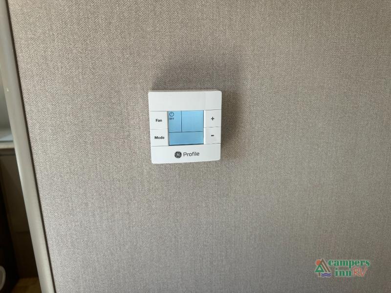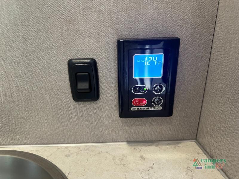 The front bedroom features a pillowtop memory foam mattress with LED reading lights, blackout curtains, and plenty of overhead storage with sliding doors for quiet, organized living. Whether you're curling up with a good book or catching some much-needed rest, you’ll feel right at home.