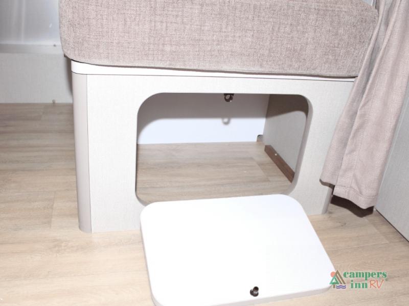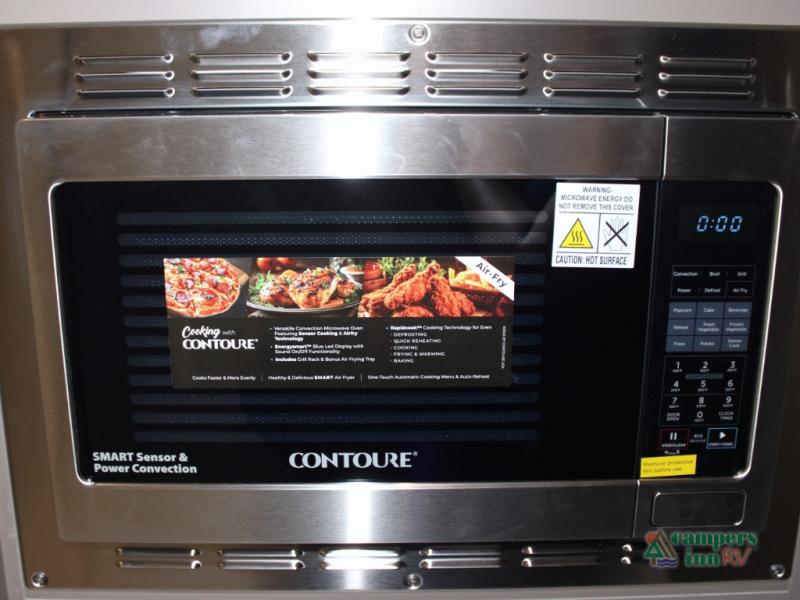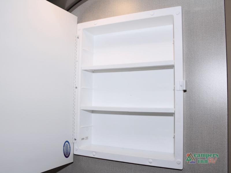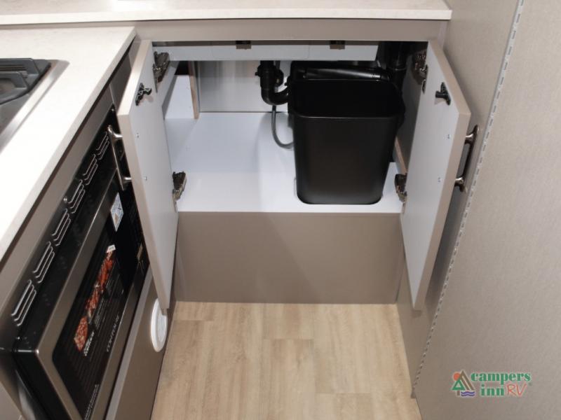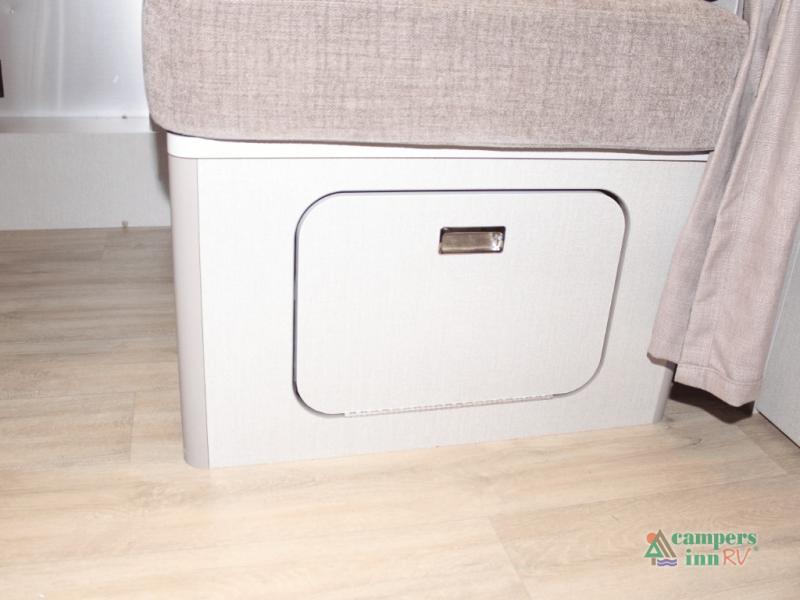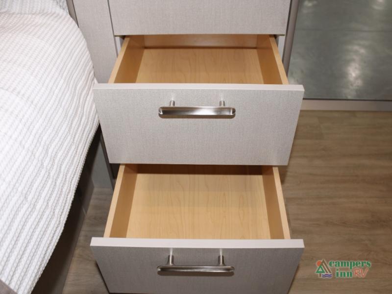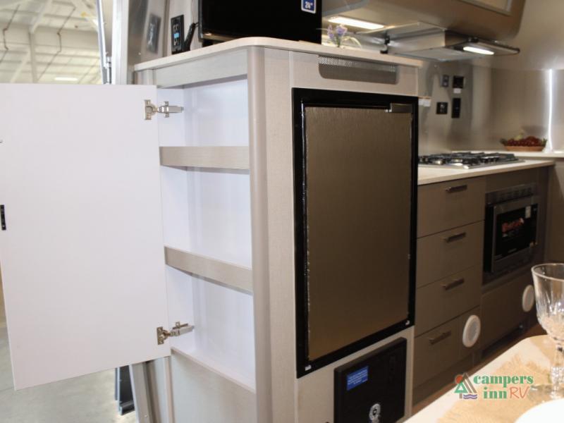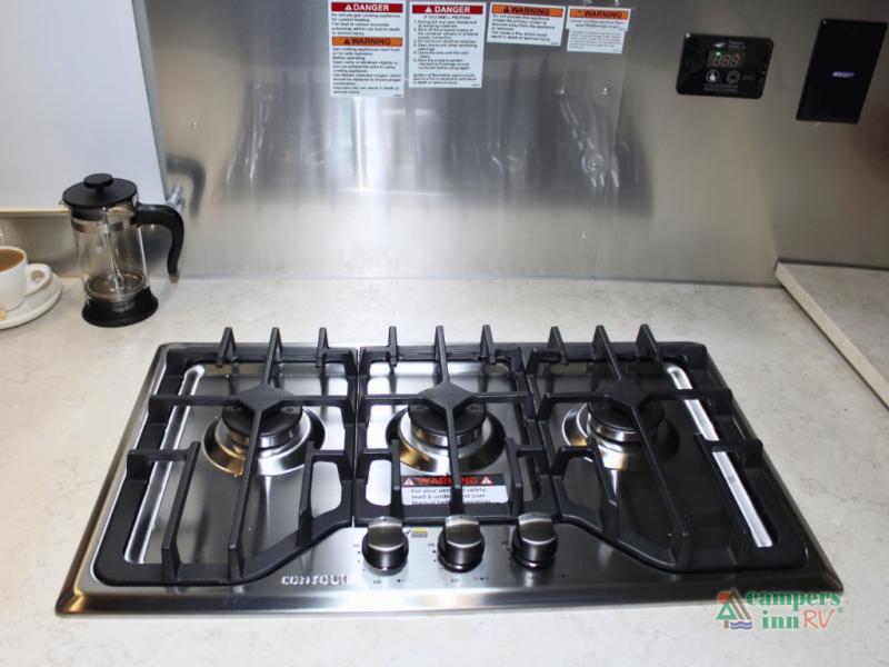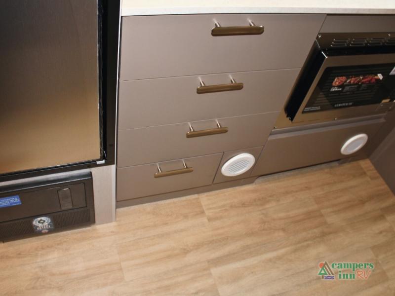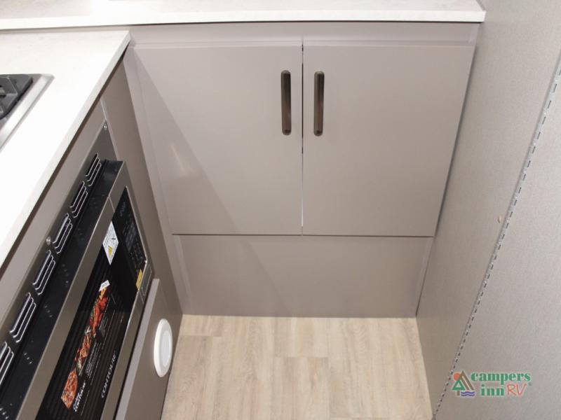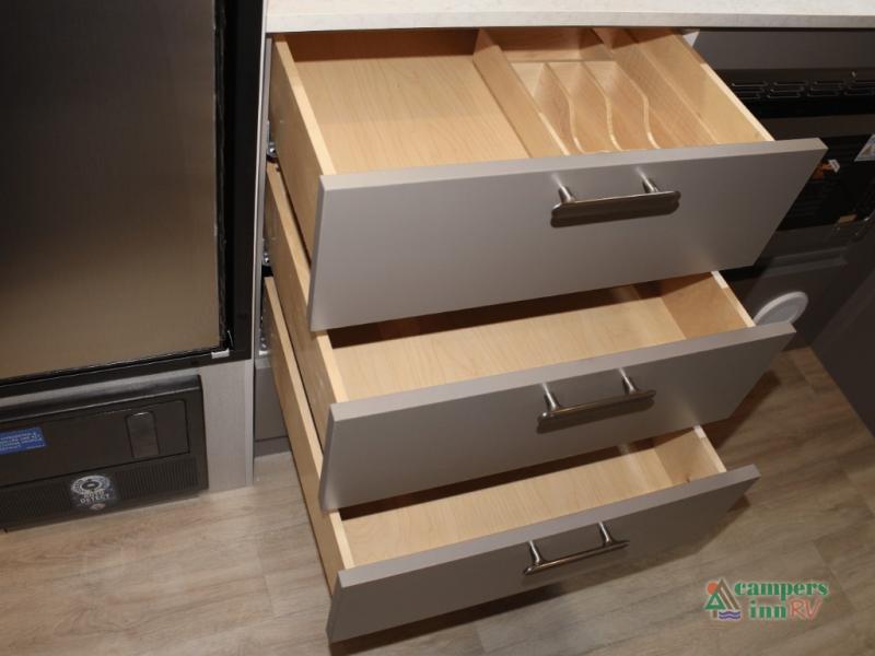 The Caravel 20FB includes a three-burner gas cooktop, microwave, stainless steel sink with Moen faucet, and a Baraldi cooking vent with light—all standard. With its efficient layout and high-end components, you can prep everything from morning coffee to gourmet dinners without compromise. Plus, ample storage drawers and pantry space mean you can bring all your essentials along for the ride.