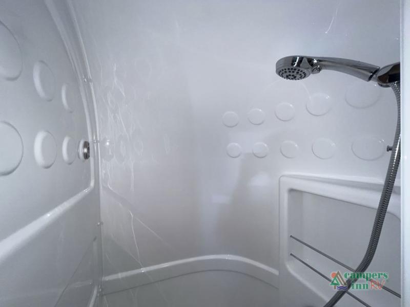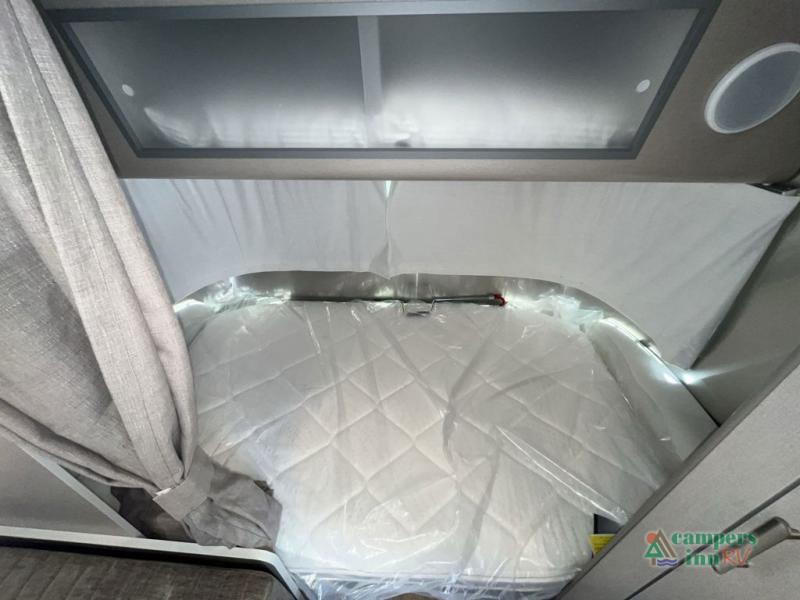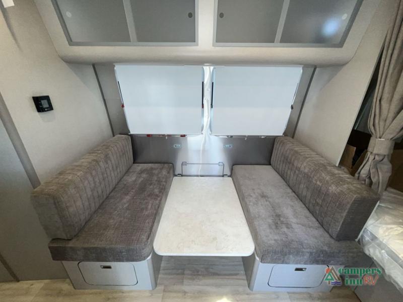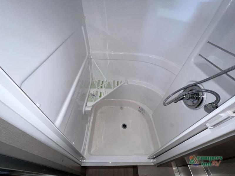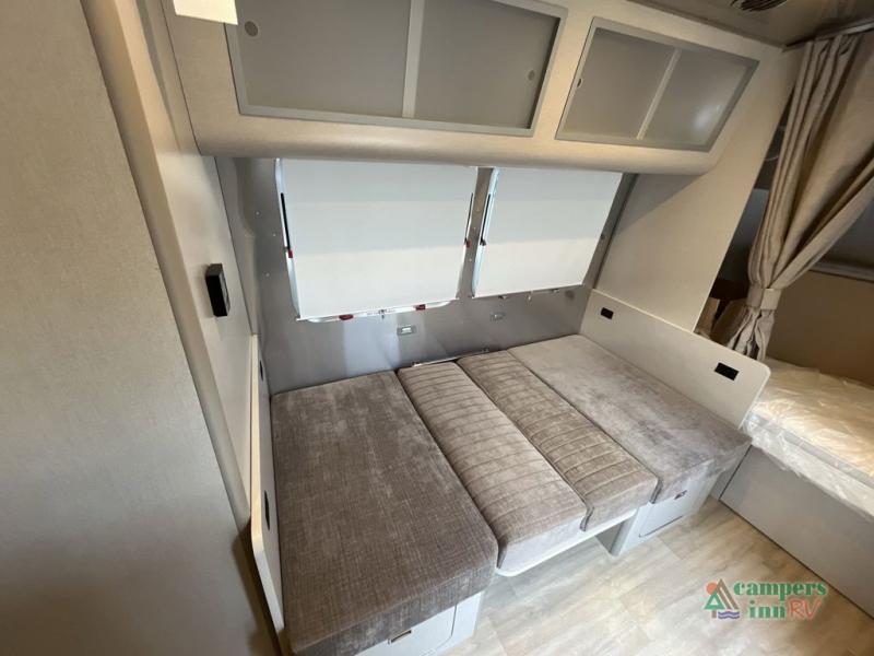 At the rear, the surprisingly spacious bathroom offers a full shower, vanity, and generous storage. The convertible dinette provides a comfortable place to work, dine, or relax, and easily transforms into an additional sleeping space when needed. With quiet climate control, ample storage, upgraded insulation, and advanced technology throughout, the Caravel 20FB is crafted for travelers who crave comfort, style, and reliability in a compact footprint.