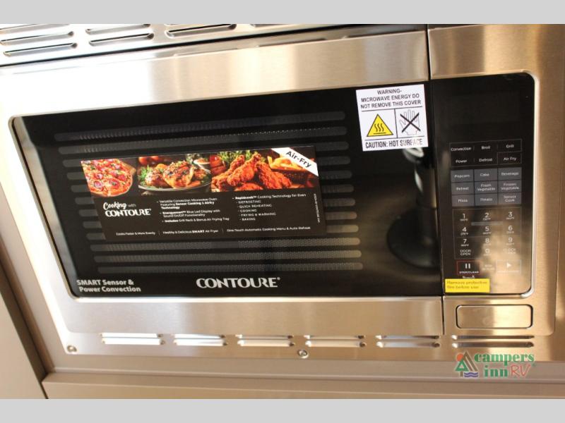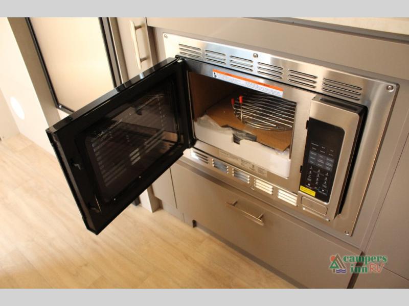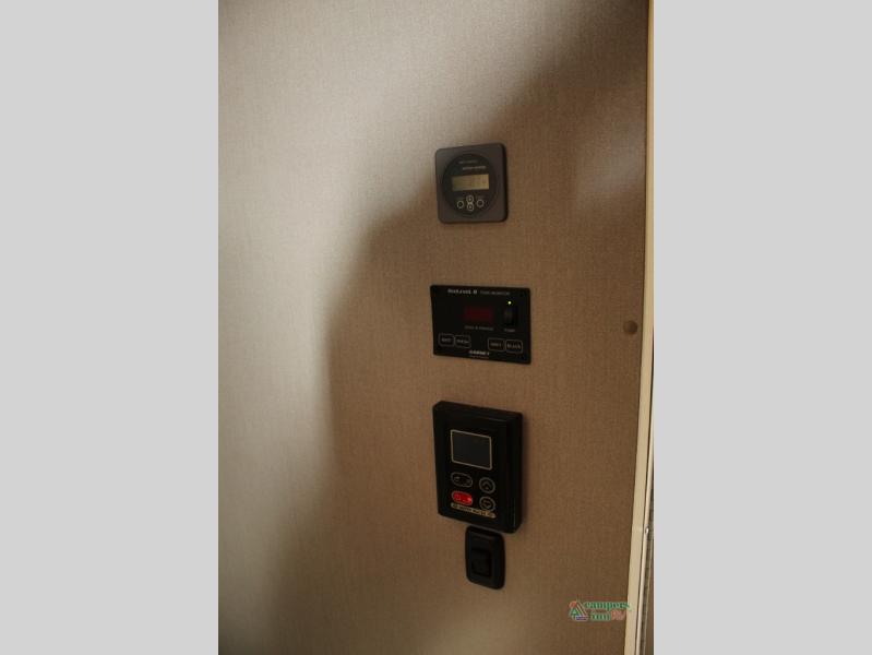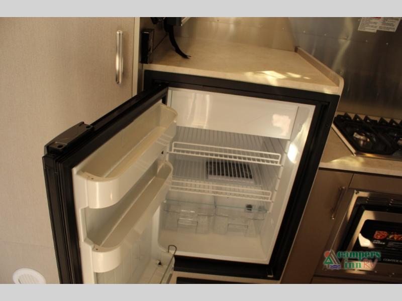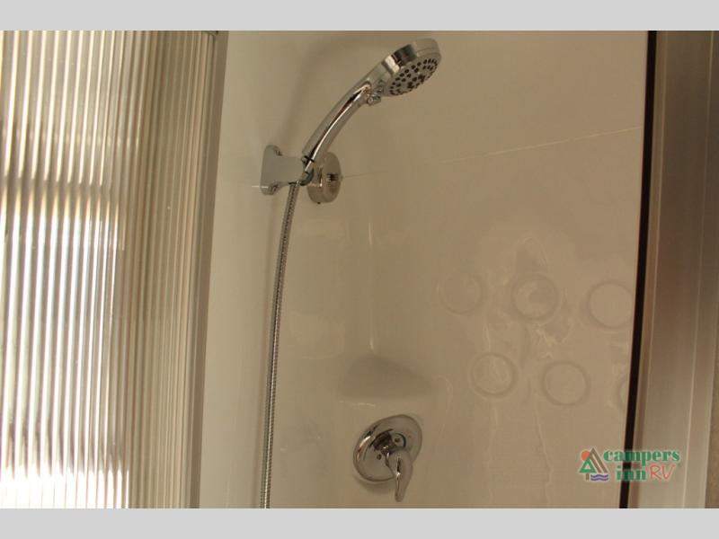 The pillowtop memory foam mattress fits perfectly into the curves of this Caravel travel trailer which offers you the perfect place to relax! There are panoramic windows surrounding this area with blackout curtains that you can close when you need some privacy, and the LED reading lights will provide some illumination while you are lounging. You can also lift up the bed to reveal the under-bed storage. The U-shaped dinette is another feature that provides two uses. It can be a great dining place for four people, or it can serve as a bed for two. The bathroom is located in the back for a little more privacy, and it offers a large vanity, a retractable clothesline in the shower, and a removable handheld shower head.
