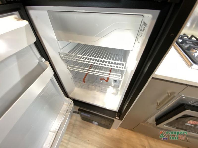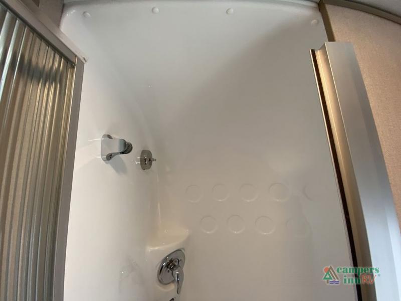 The pillowtop memory foam mattress fits perfectly into the curves of this Caravel travel trailer which offers you the perfect place to relax! There are panoramic windows surrounding this area with blackout curtains that you can close when you need some privacy, and the LED reading lights will provide some illumination while you are lounging. You can also lift up the bed to reveal the under-bed storage. The U-shaped dinette is another feature that provides two uses. It can be a great dining place for four people, or it can serve as a bed for two. The bathroom is located in the back for a little more privacy, and it offers a large vanity, a retractable clothesline in the shower, and a removable handheld shower head.