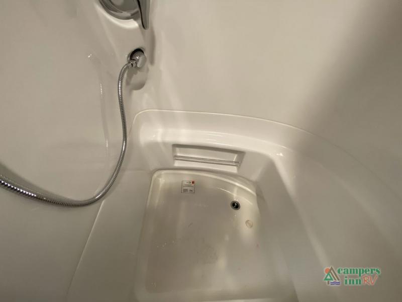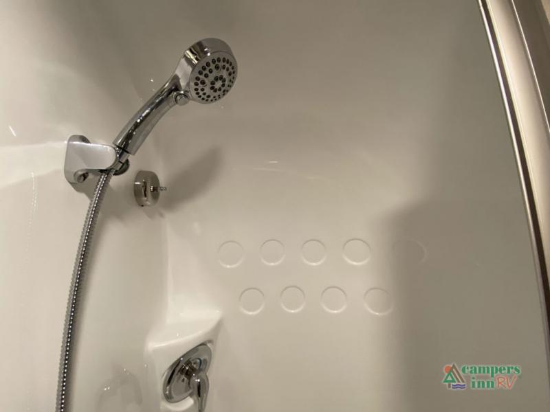The pillowtop memory foam mattress fits perfectly into the curves of this Caravel travel trailer which offers you the perfect place to relax! There are panoramic windows surrounding this area with blackout curtains that you can close when you need some privacy, and the LED reading lights will provide some illumination while you are lounging. You can also lift up the bed to reveal the under-bed storage. The U-shaped dinette is another feature that provides two uses. It can be a great dining place for four people, or it can serve as a bed for two. The bathroom is located in the back for a little more privacy, and it offers a large vanity, a retractable clothesline in the shower, and a removable handheld shower head.