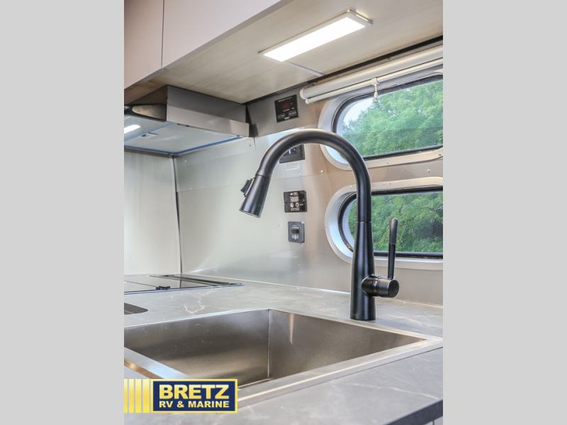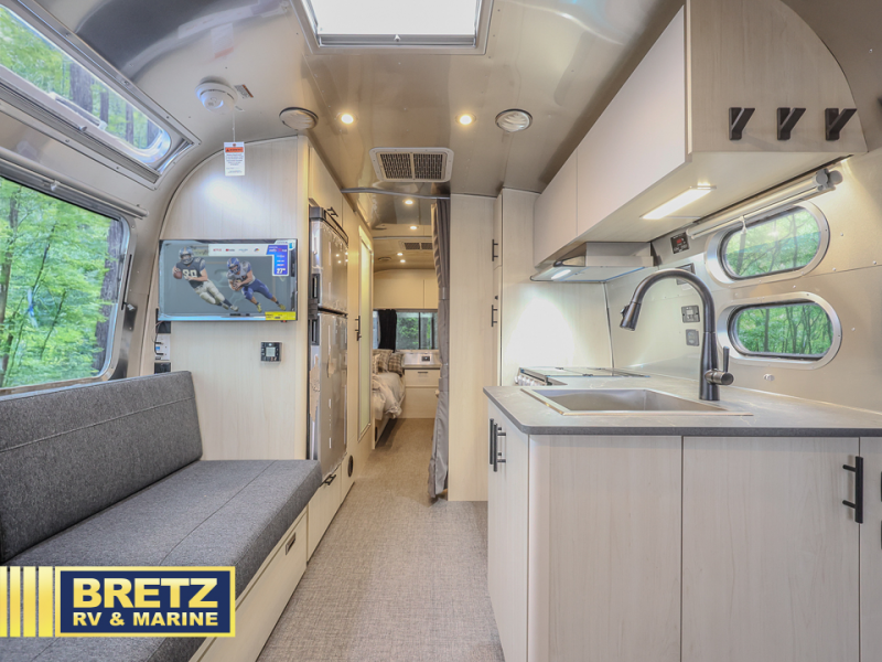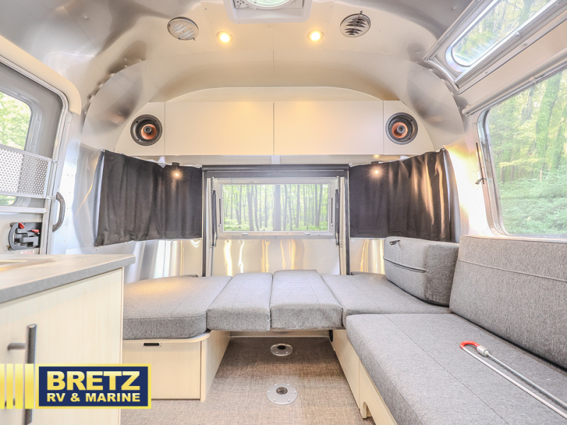 The family-friendly and popular Flying Cloud travel trailers by Airstream are built for ease of towing with a rear-view camera to make reversing and parking easier and stainless steel front stone guards to protect the lower segments from road debris. The iconic Airstream design is created outside and inside by the semi-monocoque aluminum superstructure, the temperature reducing one-piece white aluminum roof, the panoramic front windows, and the stylish aluminum wheels. The interior will have you feeling right at home with handcrafted cabinetry, plenty of storage and counter space, sleek roller blinds and blackout curtains, plus residential style faucets!