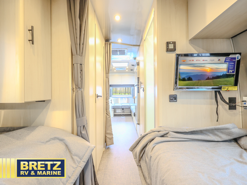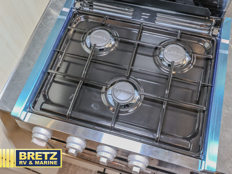 When you enjoy the finer things when traveling, this trailer will provide that for you plus lots of natural lighting and plenty of conveniences. The convertible rear dinette offers a place to dine and socialize for four, and there is a lounging area along the side with a TV on the wall. The table acts as a sturdy base below the cushions when you need some sleeping space. The front bedroom offers more panoramic windows and a comfortable queen bed or optional twin beds with a view each morning and night. You will find storage for your clothing, and a split bathroom with a private toilet and sink on one side and a shower that stands independently across the hall. And the kitchen offers everything you need to make meals including extra counter space and a refrigerator for leftovers. And there is a rear hatch option for this trailer you might want to add to let fresh air in!