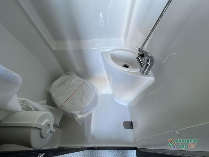 Your adventures are made complete in this 19' coach that can sleep two comfortably. When you arrive at the campground, you can prepare lunch on the two burner cooktop with an integrated cover, or use the convection microwave. There is also a slide out pantry and a 3.2 cu. ft. 12V refrigerator and freezer for your food storage. The rear sofa/bed and side seats convert to a lay-flat bed, giving you the largest best in its class, plus there is a convenient wet bath on board to stay clean throughout your trip.