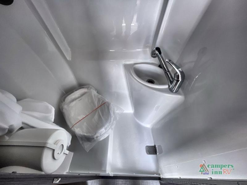 Your adventures are made complete in this 19' coach that can sleep two comfortably. When you arrive at the campground, you can prepare lunch on the two burner cooktop with an integrated cover, or use the convection microwave. There is also a slide out pantry and a 3.2 cu. ft. 12V refrigerator and freezer for your food storage. The rear sofa/bed and side seats convert to a lay-flat bed, giving you the largest best in its class, plus there is a convenient wet bath on board to stay clean throughout your trip.