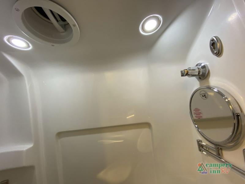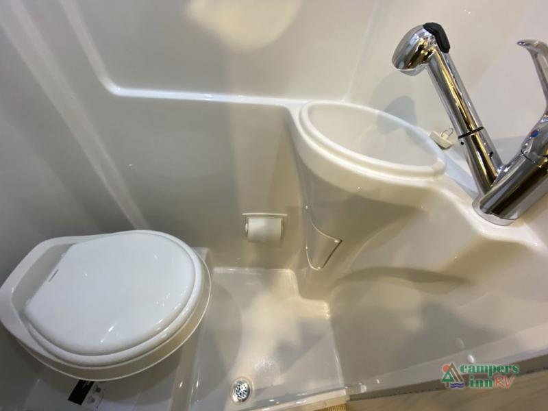 This motorhome is ready to take everyone to each destination in comfort and style! You can even stay overnight without booking a hotel room and stay squeaky clean with a wet bath that has a one-piece shower, a riveted aluminum porthole door, a toilet, a sink with an articulated mirror, a towel rack, and even a retractable clothesline. Keep your bellies full with the two-burner cooktop, the drawer-style microwave and a 3.1 cu. ft. refrigerator under the Corian counter, plus there is a flip-up countertop to make it easier for meal prepping. The rear power sofa is not only great for sitting on during the day, but also for sleeping on at night once it is folded down to turn the entire rear of the unit into a singular sleeping space. In between the two captain's chairs and the two side seats is a removable table to play games and eat meals!