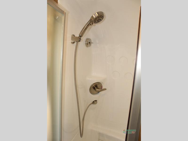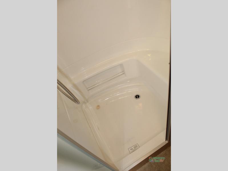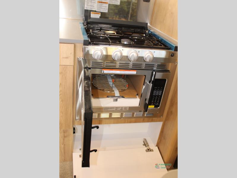 This travel trailer has a layout that feels spacious while still offering privacy! The front bedroom has twin beds with bedspreads, panoramic front window, wardrobe, and even a Smart TV. You can choose a dual twin bed option if you would prefer that flexibility. The rear full bath has every amenity you need, including a reeded glass shower door, removable hand held shower head, and a retractable clothes line so you can hang your laundry or bathing suits. At the center of the action are the living room and kitchen, with a U-dinette for comfortable seating. Convert the dinette to additional sleeping space at night if you need. Cook up your meals with the high-end appliances, including a 12V refrigerator, three burner stove, and oven, or you can choose the optional convection microwave.