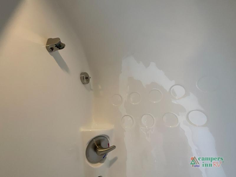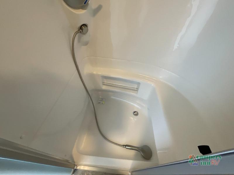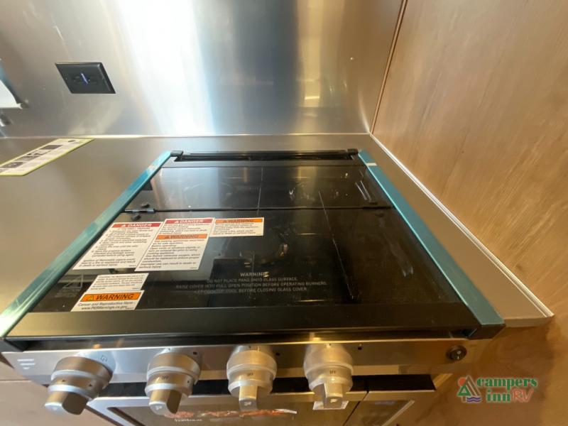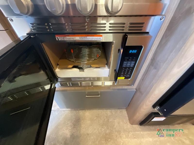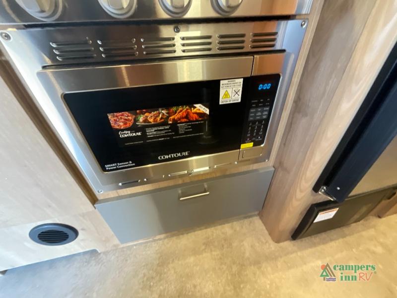 The twin bed layout in the front bedroom offers exceptional flexibility, allowing easy access and extra comfort. The convertible dinette expands your sleeping capacity, and the fully equipped kitchen—complete with a three-burner cooktop, convection microwave, and solid-surface countertops—lets you cook and dine in style. The spacious rear bath adds residential comfort with a full shower, vanity, and plenty of storage.