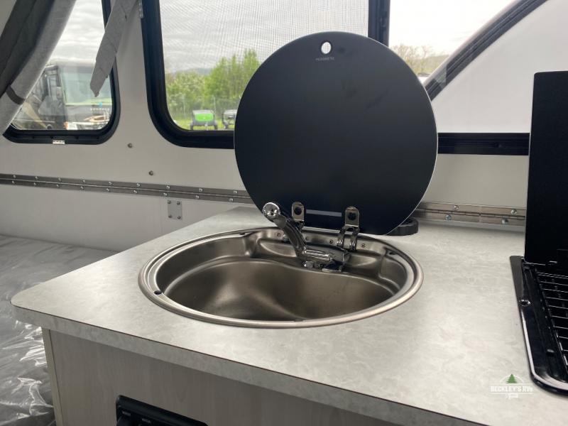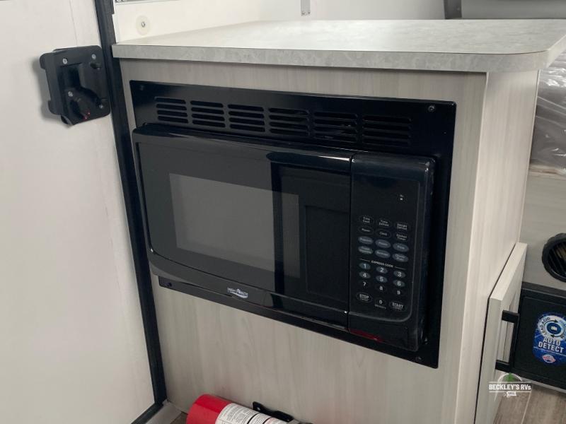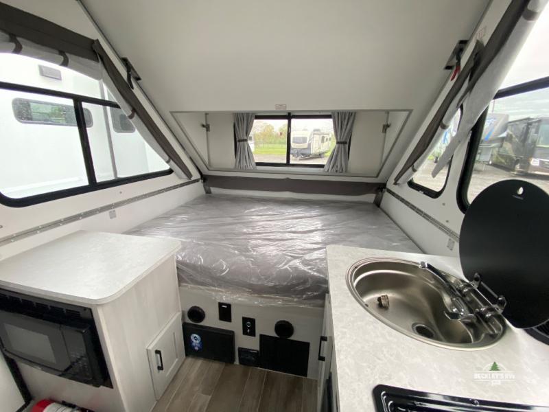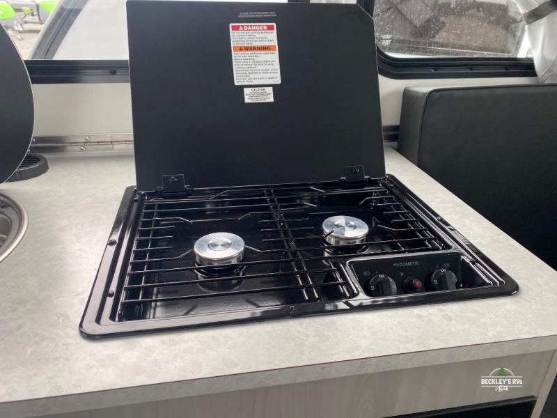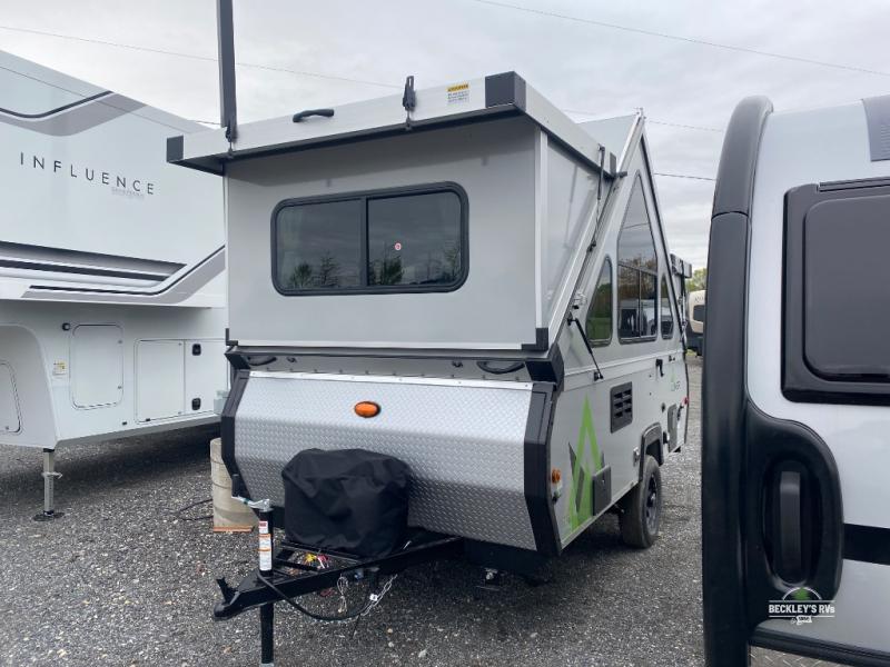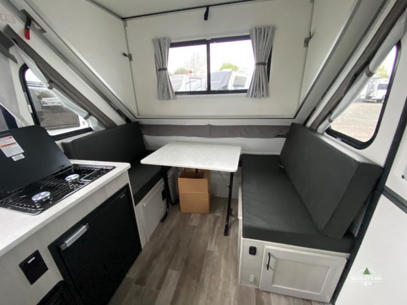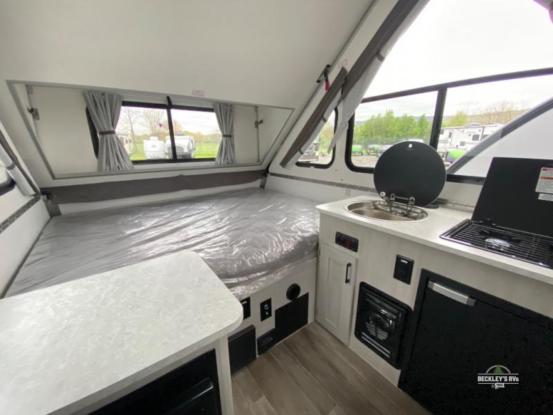 Pack your bags and be on the road in no-time with this lightweight A-frame camper that can sleep three people. You'll enjoy having a 56" x 76" permanent bed with storage underneath for your shoes or bags, and if you have a guest sleep over, they can sleep on the dinette that converts to a 46" x 76" bed. Whip up a hearty lunch on the two burner in/out stove, or use the convenient microwave oven. There is also a 3.0 cu. ft. 2-way refrigerator for perishables and additional storage space for dry goods.