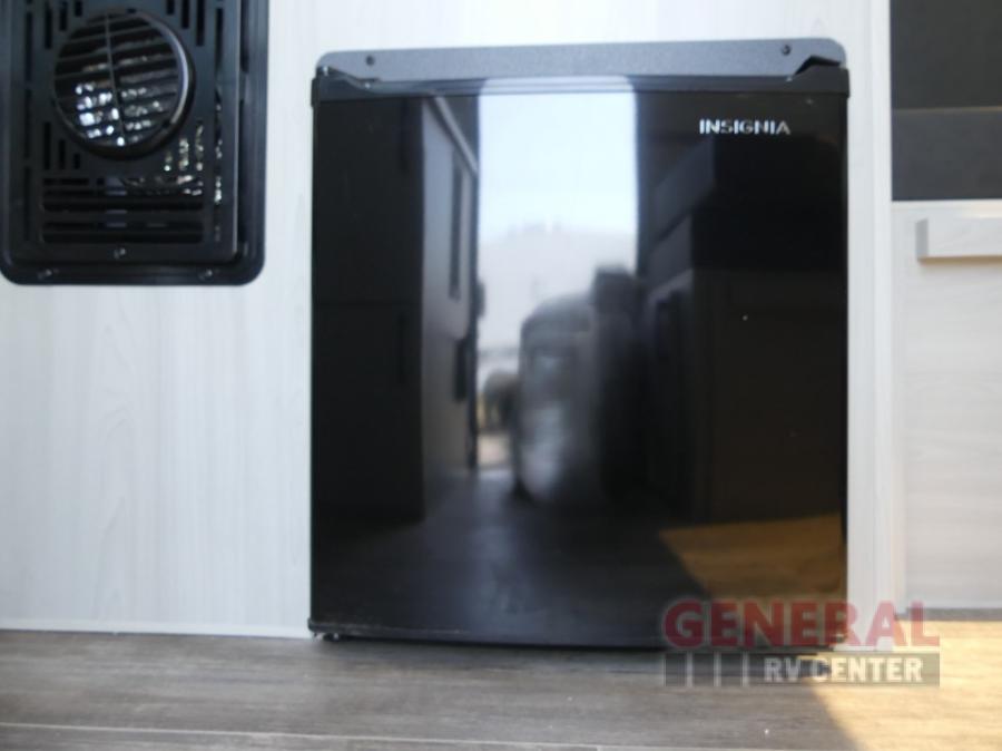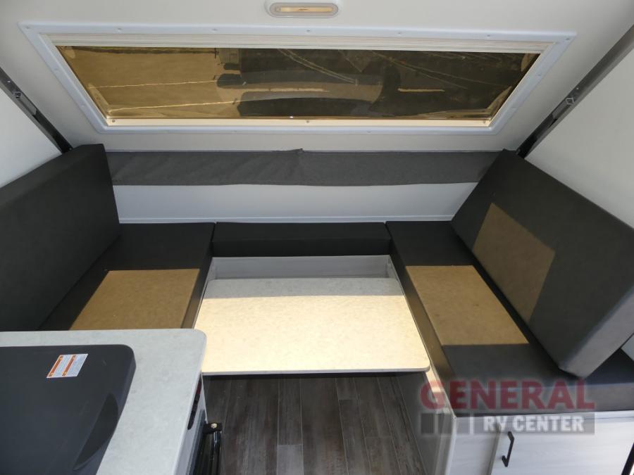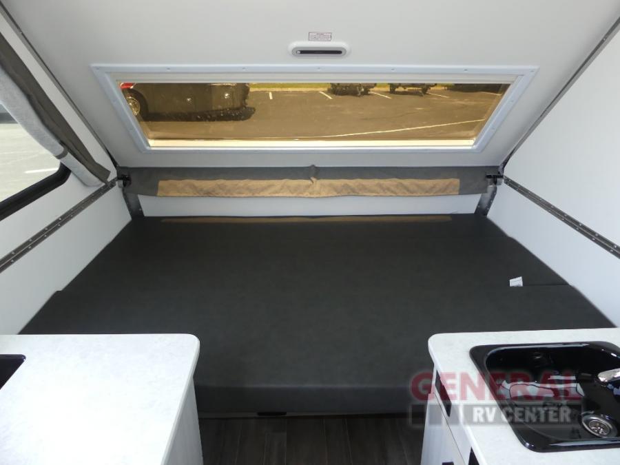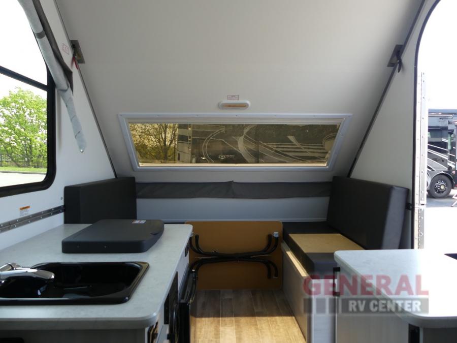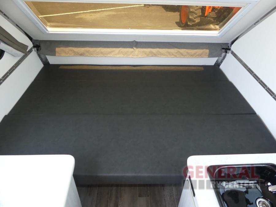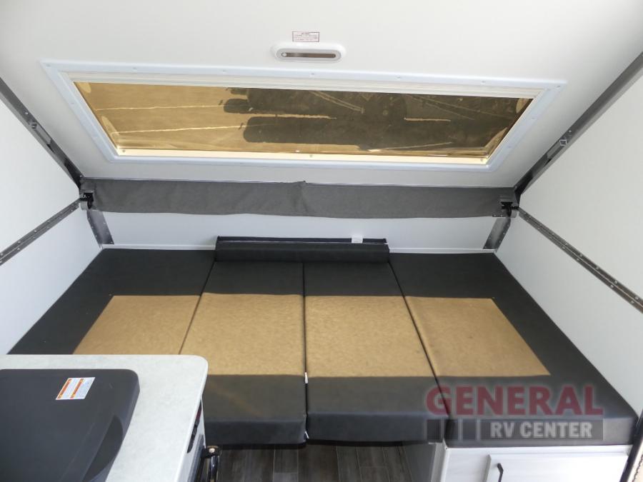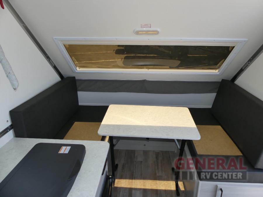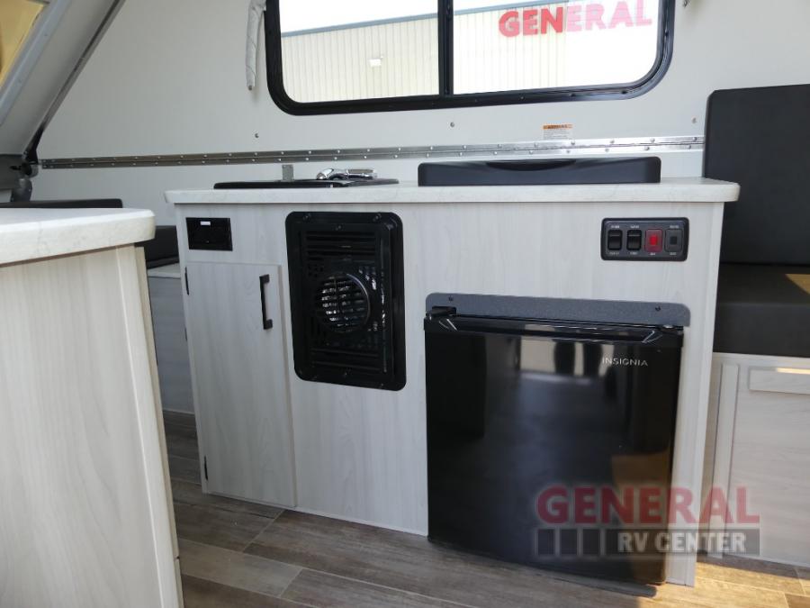 With any Ranger A-frame camper by ALiner, the construction includes Azdel lightweight, composite interior wall and ceiling panels for added durability. Inside, there is high density foam, hypoallergenic cushions and mattress, a 12 Volt refrigerator/freezer, three interior electrical outlets, and LED lights to keep your space well lit.