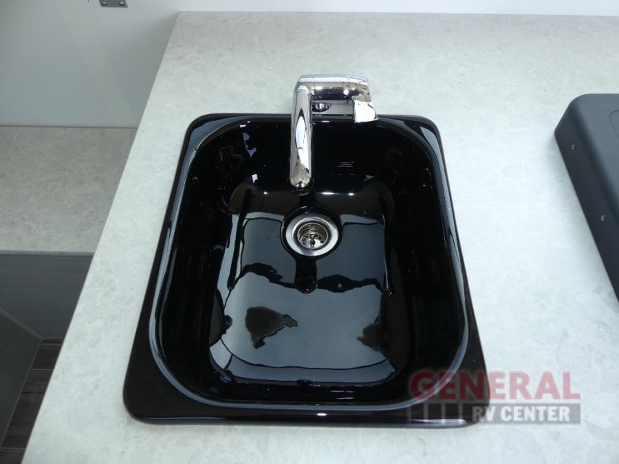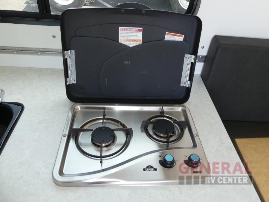 Looking for a camper that you can relax and unwind inside when you aren't exploring outdoors? Need sleeping space for two or three? Well the rear sofa bed in this camper converts into a 56" x 76" bed and the front dinette converts into a 46" x 76" bed. You will find storage space under the dinette seats, shelves on either side of the sofa, and a storage area across from the kitchen. You can prepare delicious meals with the two burner stove, clean up with the sink, and keep your perishables fresh within the refrigerator/freezer underneath the stove and sink.