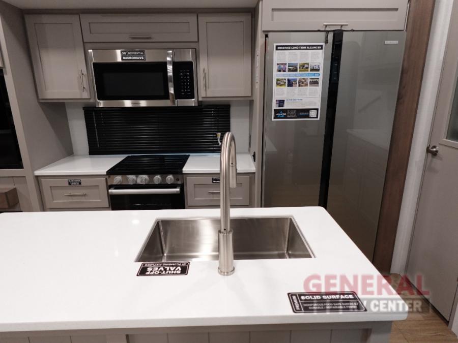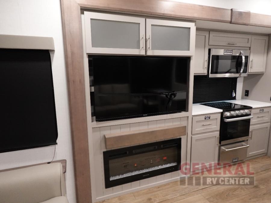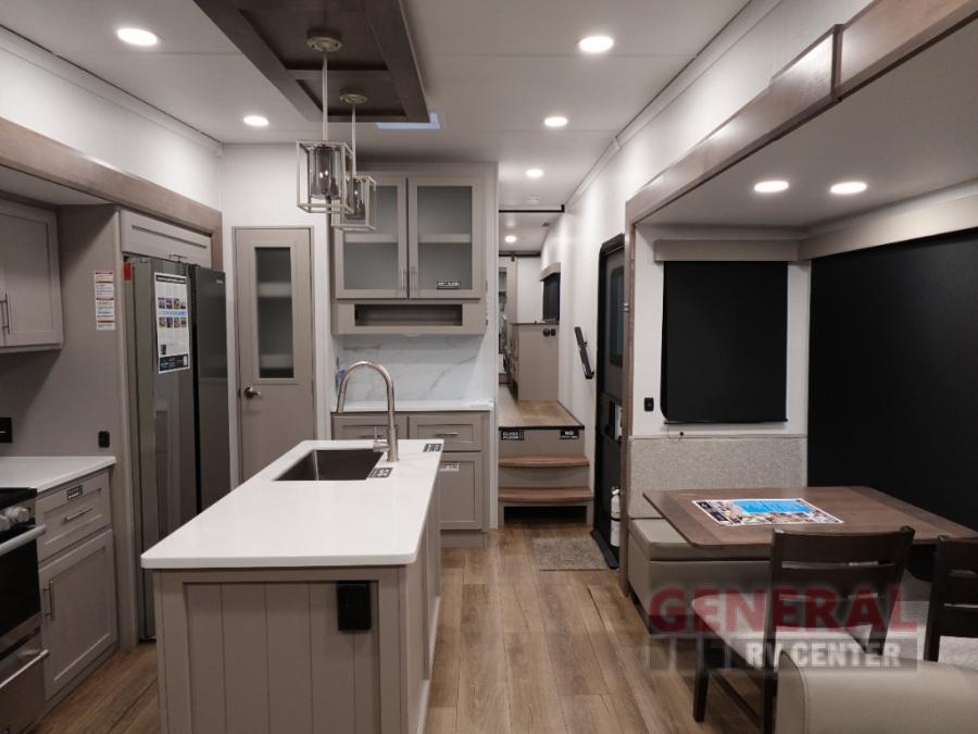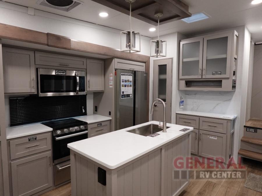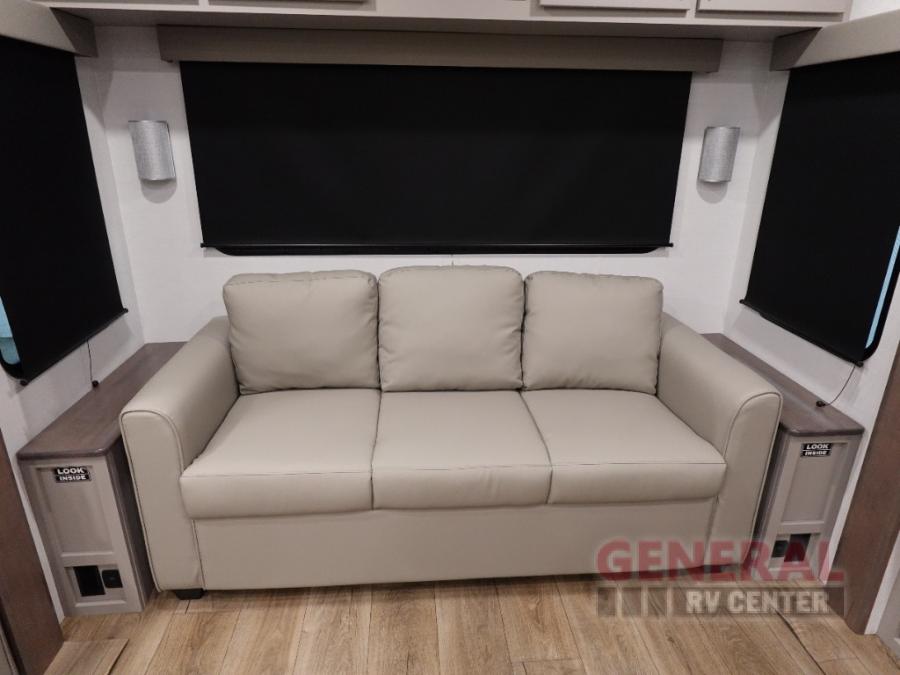 A kitchen island with countertop space makes it easy to prepare meals in this fifth wheel! The floating dinette table has two chairs on one side and a movable ottoman with flip up storage on the other side to keep your games or extra table cloths in. You can store your dishes and snacks inside the hutch/pantry or in the second pantry. The front private bedroom has a king bed slide. There is also a dresser and large wardrobe for storage, and either side of the wardrobe with washer and dryer prep. The rear living area features a dual recliner theater seat across from an entertainment center with a 50" class HDTV with hidden storage behind it, and is also on a swing mount for all to see even at the rear sleeper sofa!