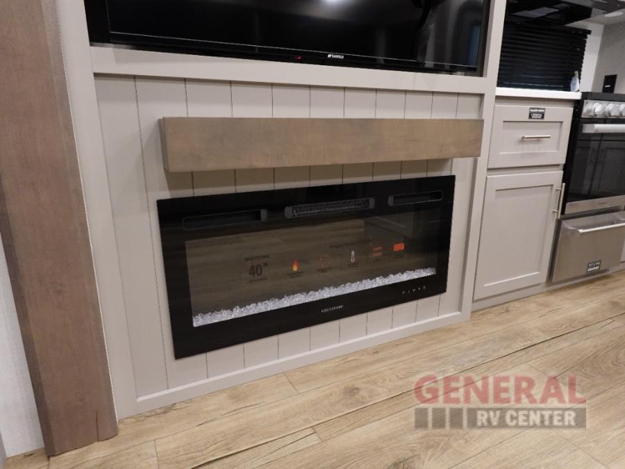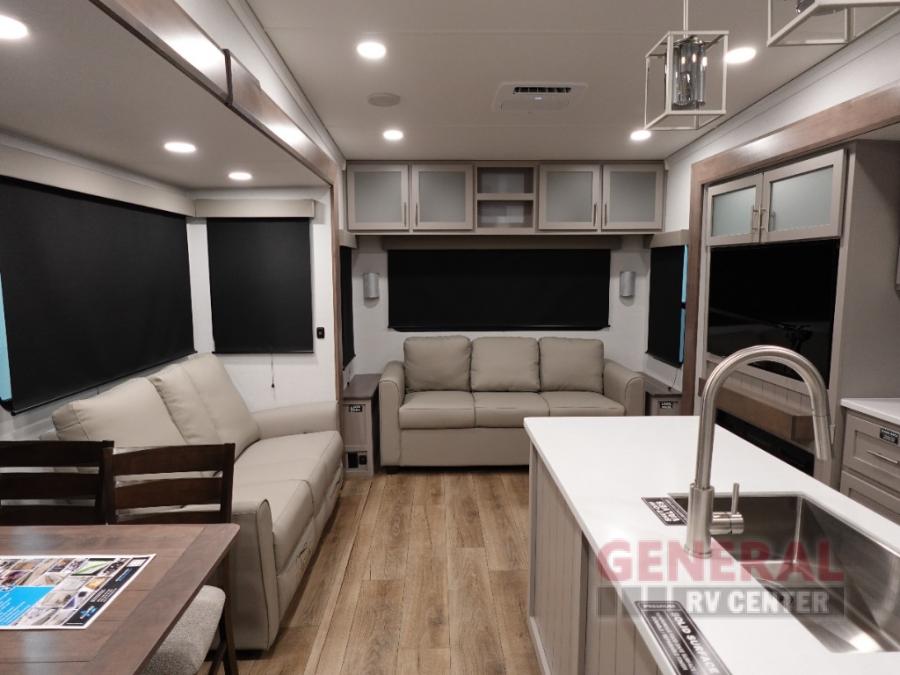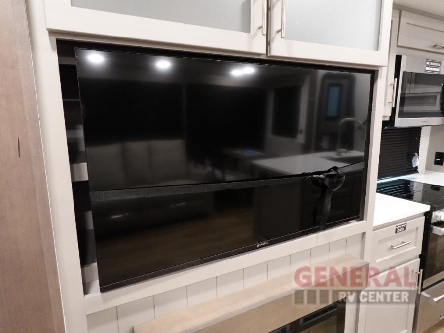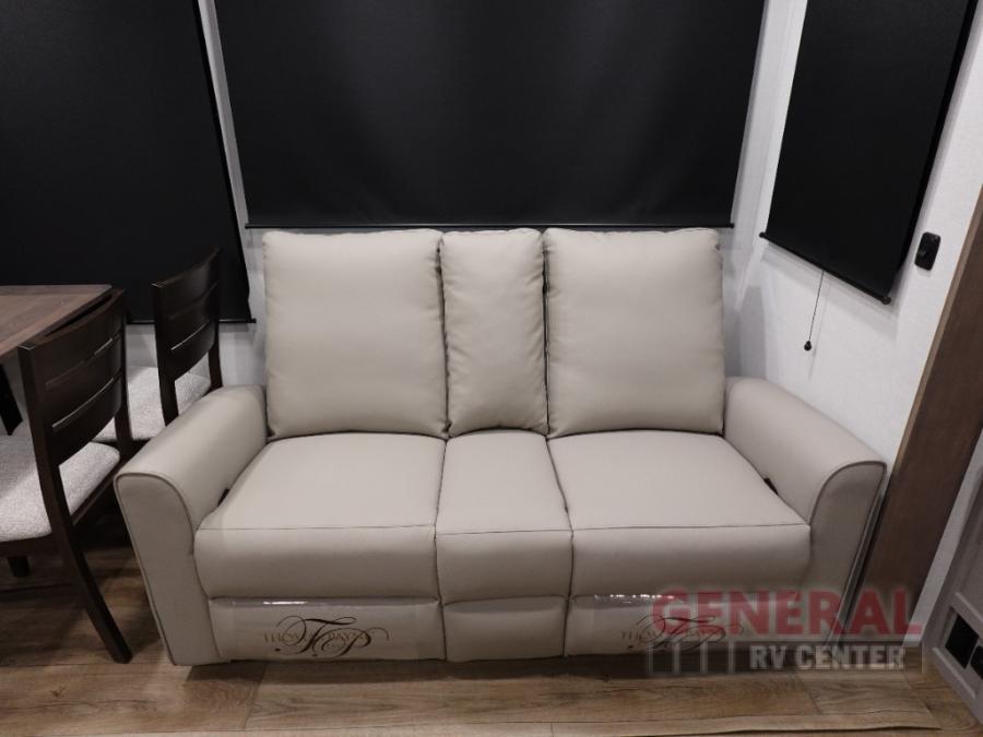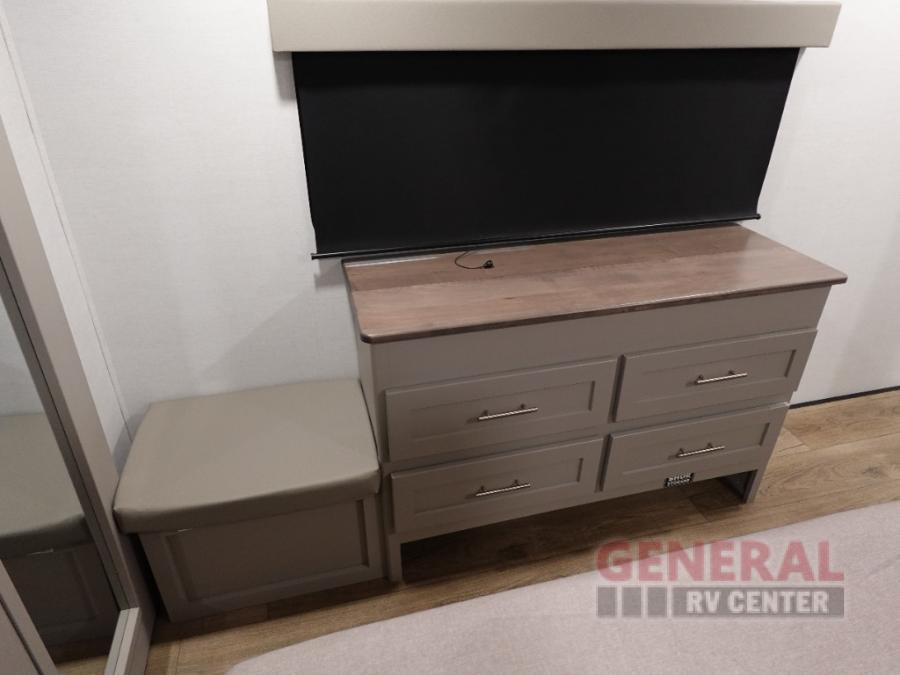A kitchen island with countertop space makes it easy to prepare meals in this fifth wheel! The floating dinette table has two chairs on one side and a movable ottoman with flip up storage on the other side to keep your games or extra table cloths in. You can store your dishes and snacks inside the hutch/pantry or in the second pantry. The front private bedroom has a king bed slide. There is also a dresser and large wardrobe for storage, and either side of the wardrobe with washer and dryer prep. The rear living area features a dual recliner theater seat across from an entertainment center with a 50" class HDTV with hidden storage behind it, and is also on a swing mount for all to see even at the rear sleeper sofa!