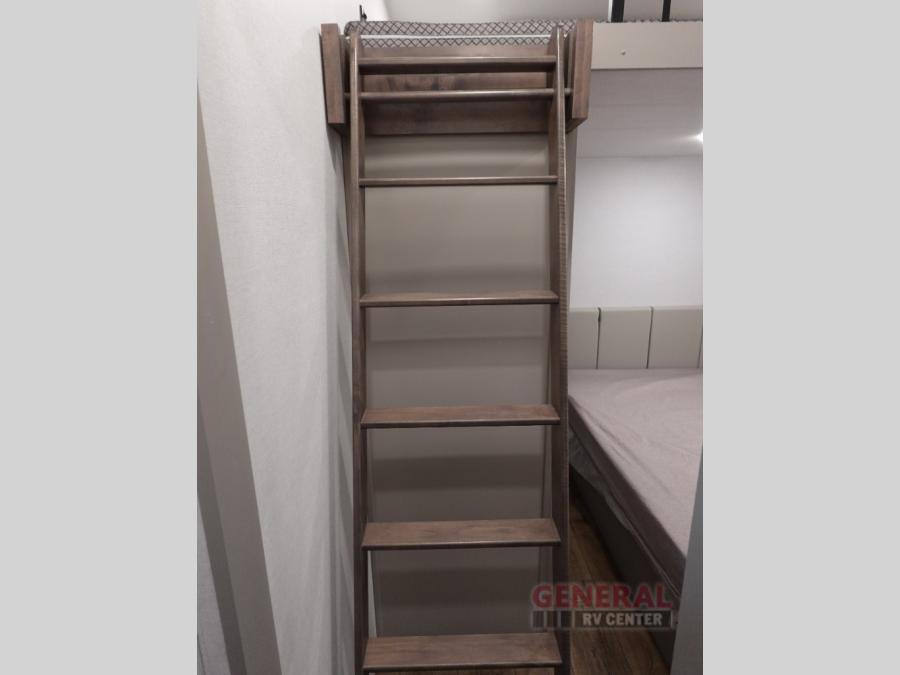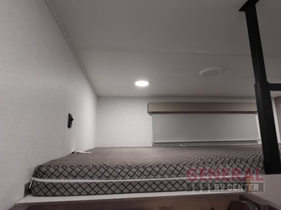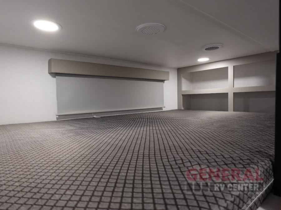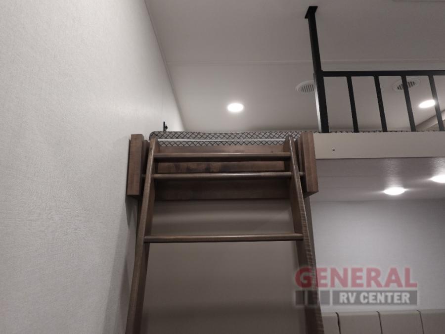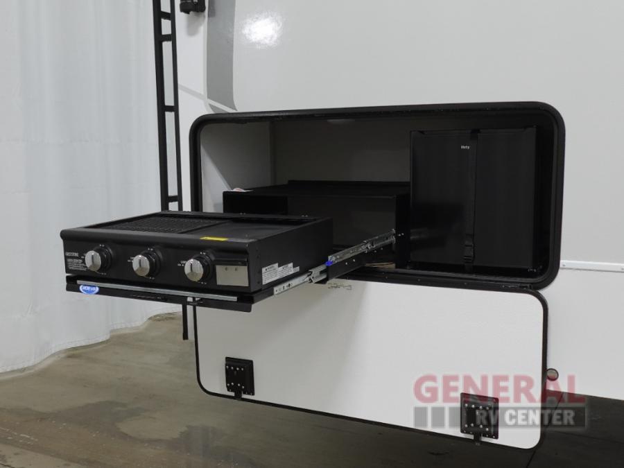 The whole gang can join in on the fun in this fifth wheel! The rear private 54" x 74" loft bed features a lower 60" x 70" bed beneath with storage and a TV, and its very own half bathroom with private entry/exit to the outside. There is also an exterior baggage door so you can easily pack gear straight into this room. The living area comes with dual recliner theater seating, a swing out 50" class HDTV, and a floating dinette table with two chairs and a movable ottoman with flip up storage. There is also a 16 cu. ft. 12 volt refrigerator and pull-out pantry here for food storage. And you can easily prepare your best home cooked meals using the three burner cooktop. When you're ready to wind down your night, head to the front private bedroom and relax on the king bed slide. This unit also features an outdoor griddle and refrigerator under the loft space.