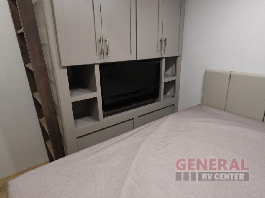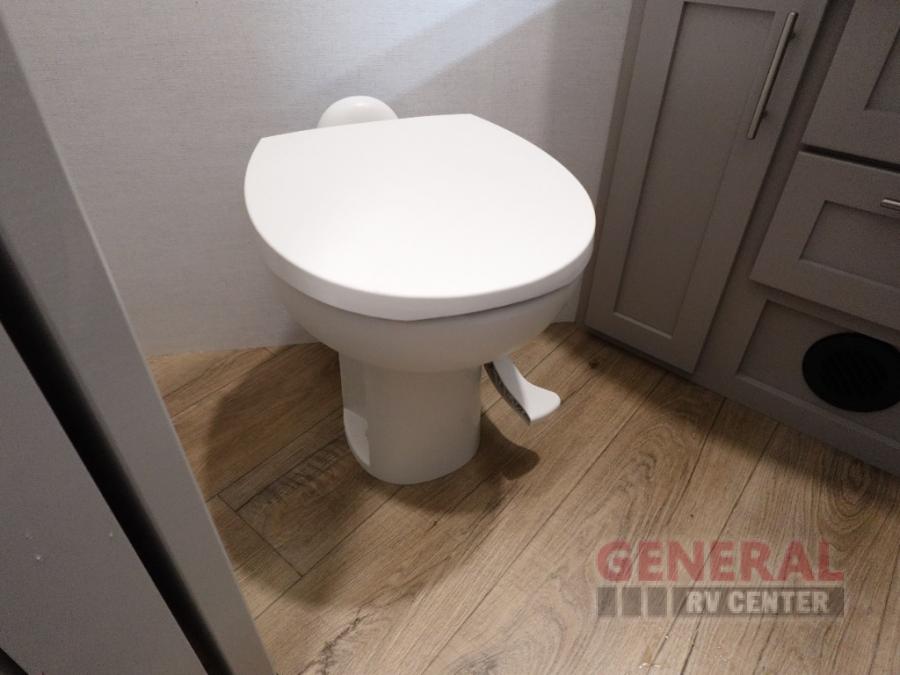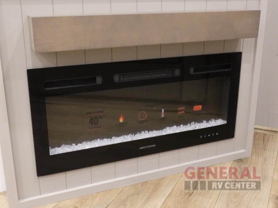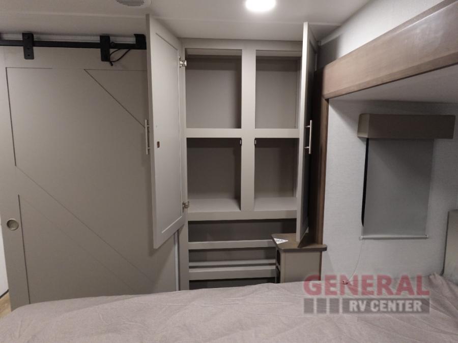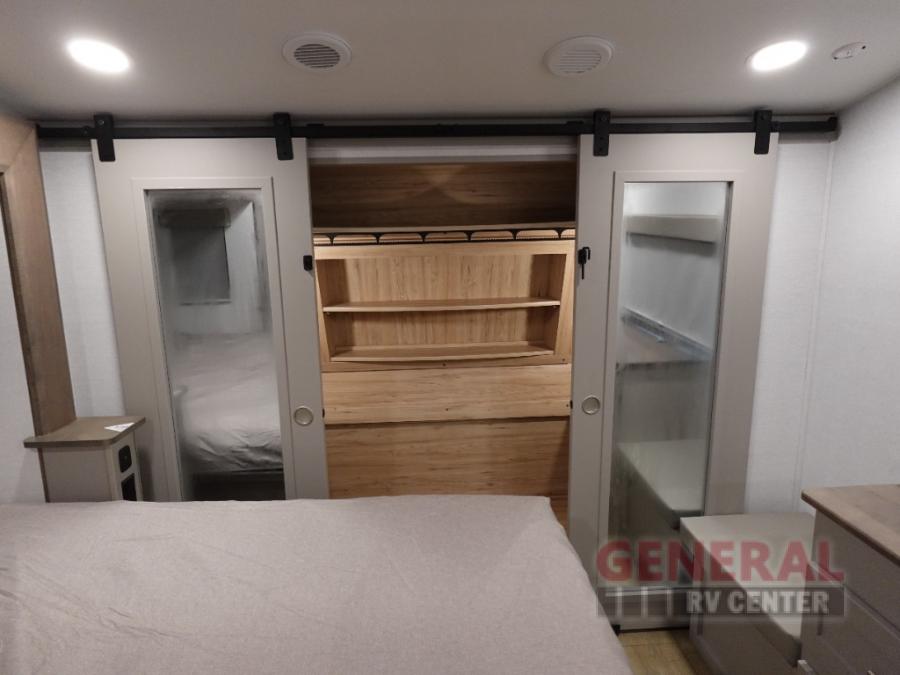 The whole gang can join in on the fun in this fifth wheel! The rear private 54" x 74" loft bed features a lower 60" x 70" bed beneath with storage and a TV, and its very own half bathroom with private entry/exit to the outside. There is also an exterior baggage door so you can easily pack gear straight into this room. The living area comes with dual recliner theater seating, a swing out 50" class HDTV, and a floating dinette table with two chairs and a movable ottoman with flip up storage. There is also a 16 cu. ft. 12 volt refrigerator and pull-out pantry here for food storage. And you can easily prepare your best home cooked meals using the three burner cooktop. When you're ready to wind down your night, head to the front private bedroom and relax on the king bed slide. This unit also features an outdoor griddle and refrigerator under the loft space.