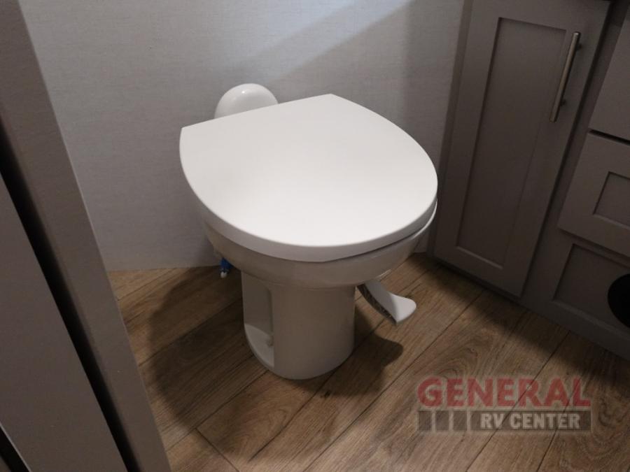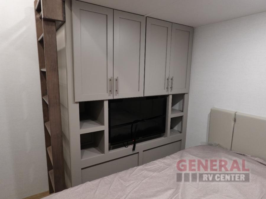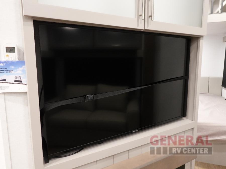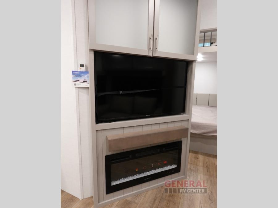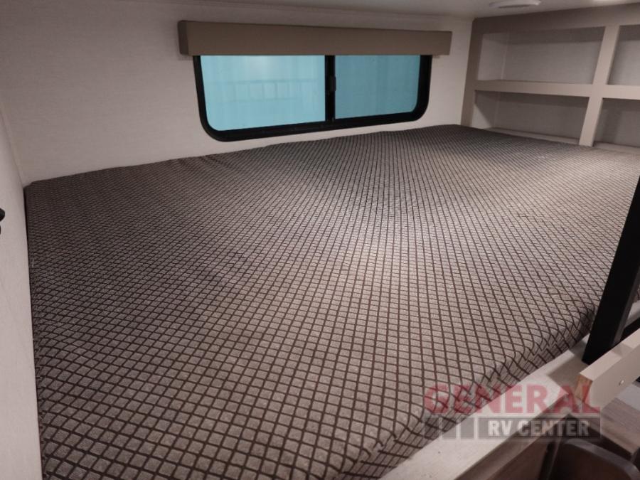 The whole gang can join in on the fun in this fifth wheel! The rear private 54" x 74" loft bed features a lower 60" x 70" bed beneath with storage and a TV, and its very own half bathroom with private entry/exit to the outside. There is also an exterior baggage door so you can easily pack gear straight into this room. The living area comes with dual recliner theater seating, a swing out 50" class HDTV, and a floating dinette table with two chairs and a movable ottoman with flip up storage. There is also a 16 cu. ft. 12 volt refrigerator and pull-out pantry here for food storage. And you can easily prepare your best home cooked meals using the three burner cooktop.