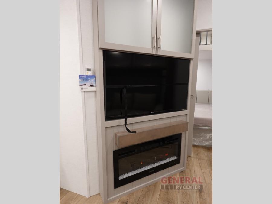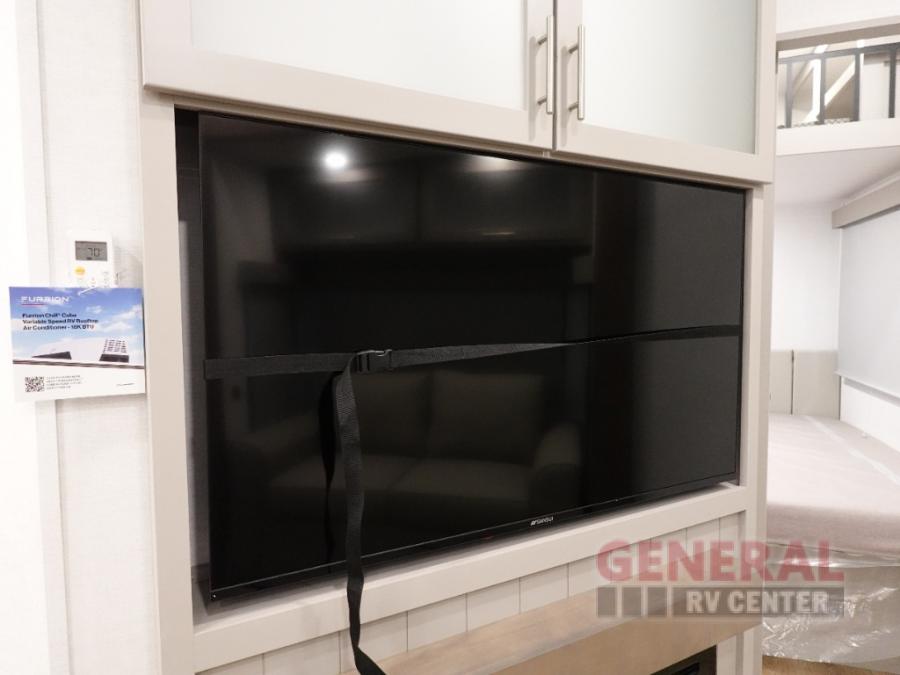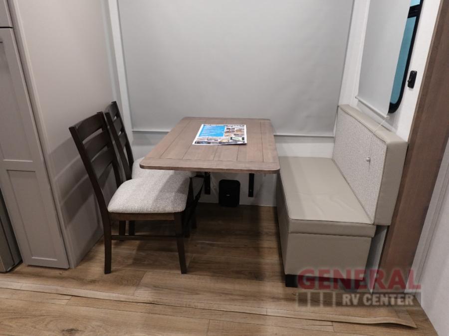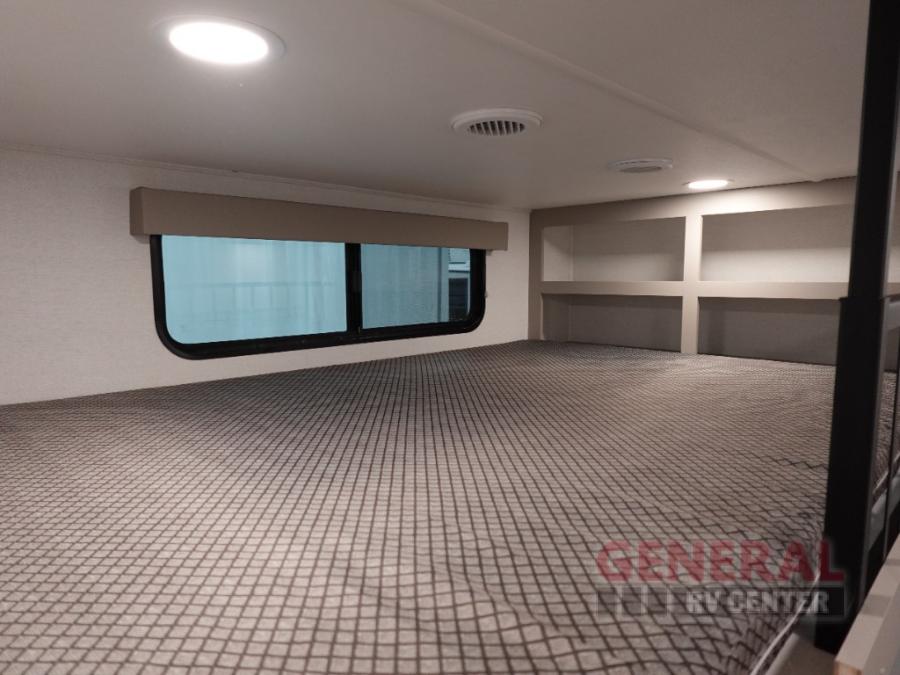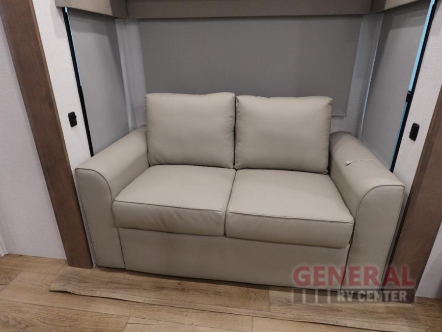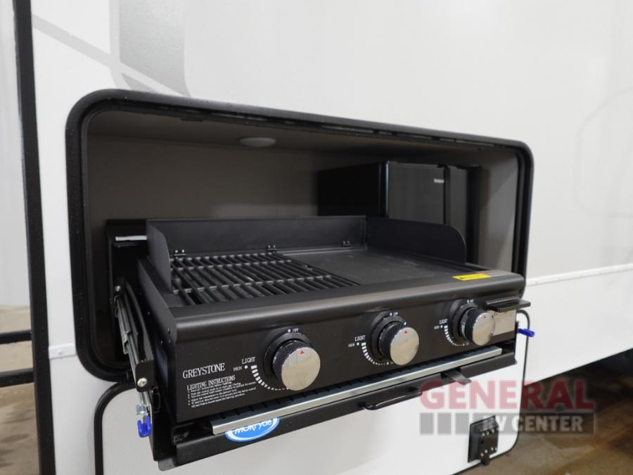The whole gang can join in on the fun in this fifth wheel! The rear private 54" x 74" loft bed features a lower 60" x 70" bed beneath with storage and a TV, and its very own half bathroom with private entry/exit to the outside. There is also an exterior baggage door so you can easily pack gear straight into this room. The living area comes with dual recliner theater seating, a swing out 50" class HDTV, and a floating dinette table with two chairs and a movable ottoman with flip up storage. There is also a 16 cu. ft. 12 volt refrigerator and pull-out pantry here for food storage. And you can easily prepare your best home cooked meals using the three burner cooktop.