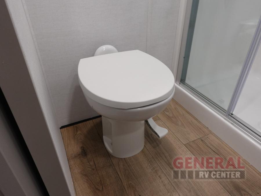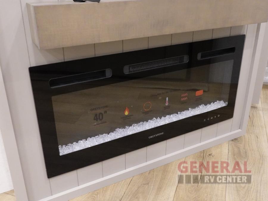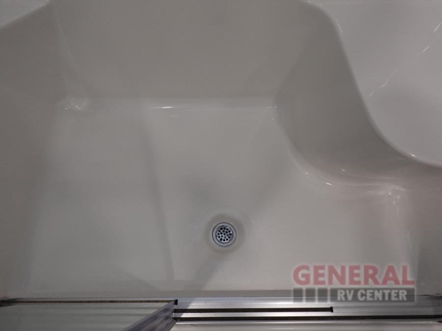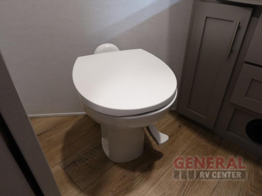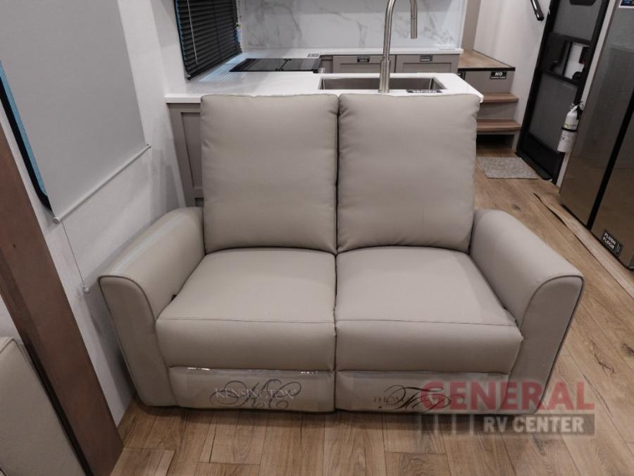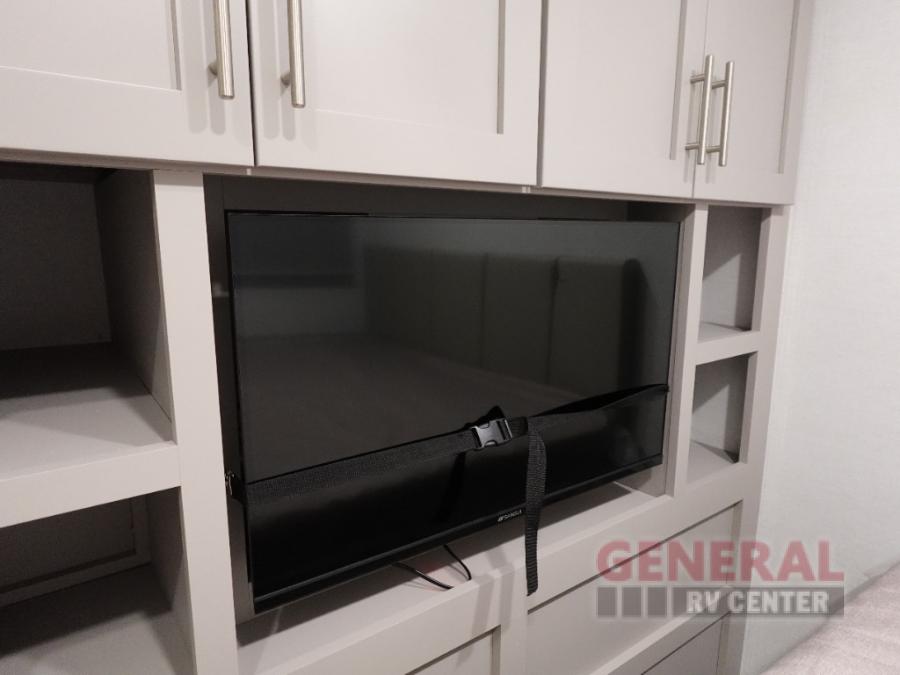 The whole gang can join in on the fun in this fifth wheel! The rear private 54" x 74" loft bed features a lower 60" x 70" bed beneath with storage and a TV, and its very own half bathroom with private entry/exit to the outside. There is also an exterior baggage door so you can easily pack gear straight into this room. The living area comes with dual recliner theater seating, a swing out 50" class HDTV, and a floating dinette table with two chairs and a movable ottoman with flip up storage. There is also a 16 cu. ft. 12 volt refrigerator and pull-out pantry here for food storage. And you can easily prepare your best home cooked meals using the three burner cooktop.