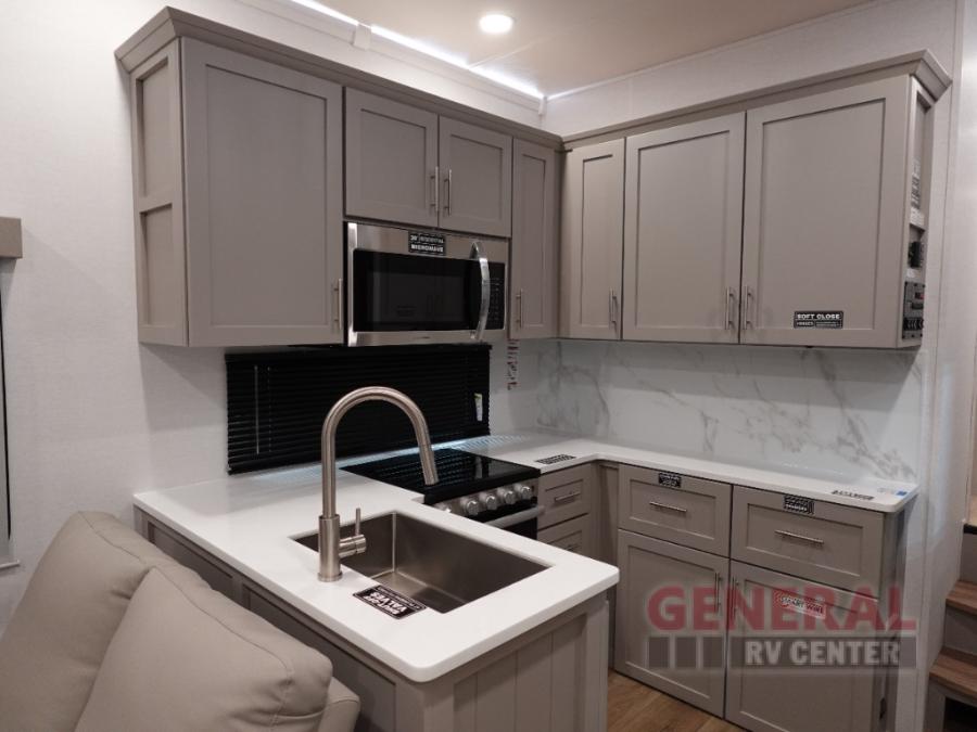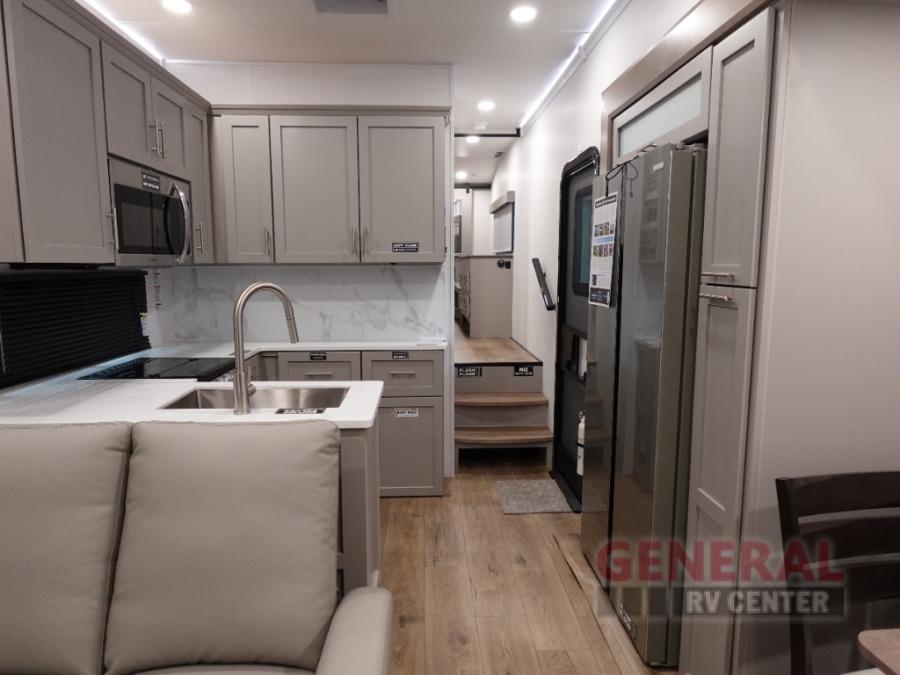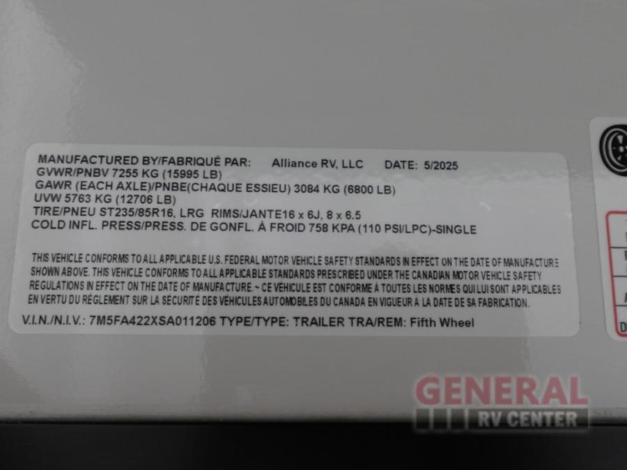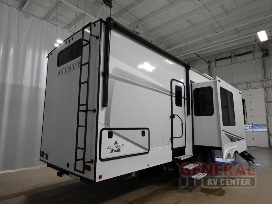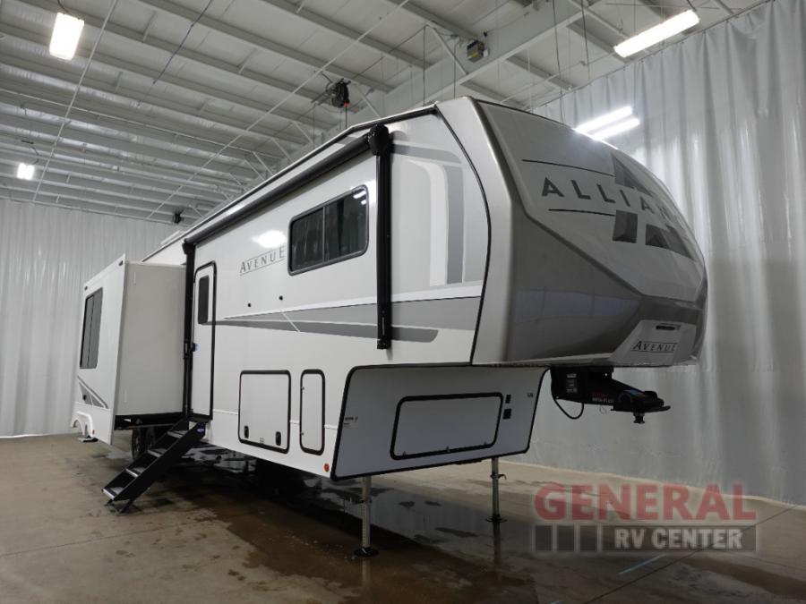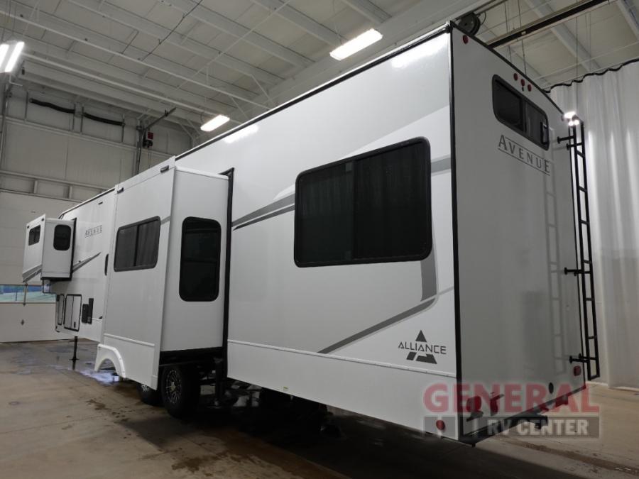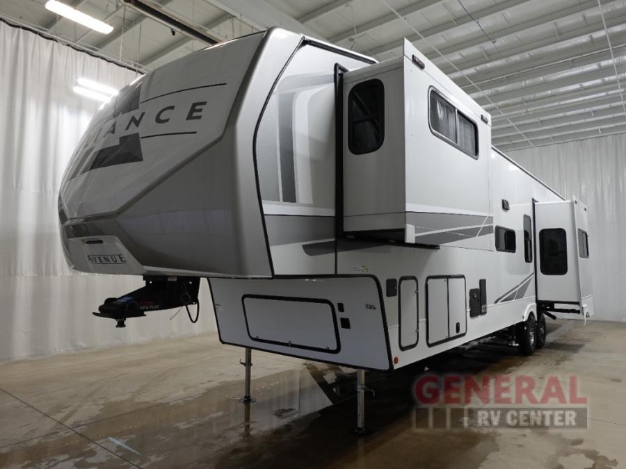 With any Avenue fifth wheel or travel trailer by Alliance RV, you will enjoy more interior space provided by the 8' 5" wide-body construction, and a long list of luxury features. Each is built with Azdel composite sidewalls both inside and out, along with a PVC roof for added strength. There are innovative storage solutions that include hidden storage behind the TV, within end tables and ottomans, and more. Since these units feature no carpet throughout, cleaning will be easier than ever, and there are flush floor slides throughout for seamless living spaces. The Avenue also comes with the OTG Solar Package with a 400 watt solar panel, inverter prep, multiple outlets, and more to keep you charged up!