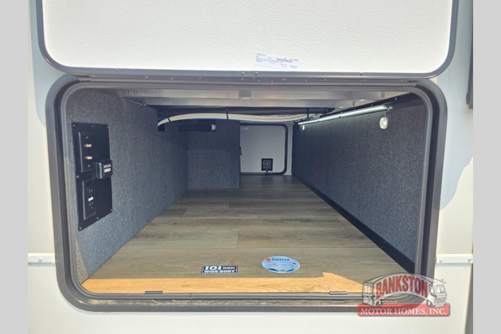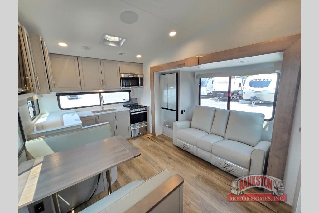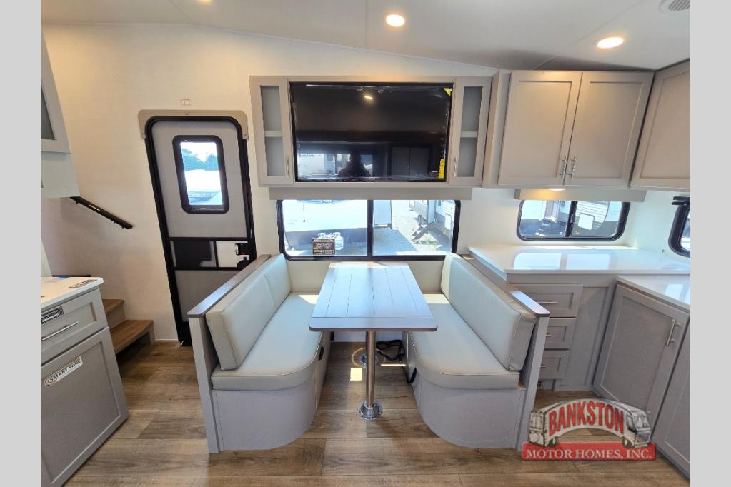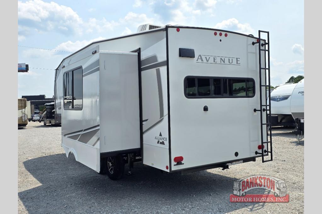 A benchmark chassis creates a space saver upper deck with each one of these Avenue All-Access fifth wheels by Alliance RV! The 101 in. wide-body construction gives you more room to walk around and the flush slide out floors throughout prevent any tripping. There are Azdel composite sidewalls inside and out, and a seamless fully walkable PVC roof for extreme durability and zero maintenance. You are sure to love the "no carpet zone" making each Avenue easy to clean and allergen free, not to mention pet friendly. You can maximize your space throughout with innovative storage solutions like the hidden storage behind the TV, inside the end tables, ottoman, and dinette chairs. These units also include the OTG Solar Package with a 200 watt solar panel, 15 amp MPPT charger, multiple outlets, and more to keep you powered up!