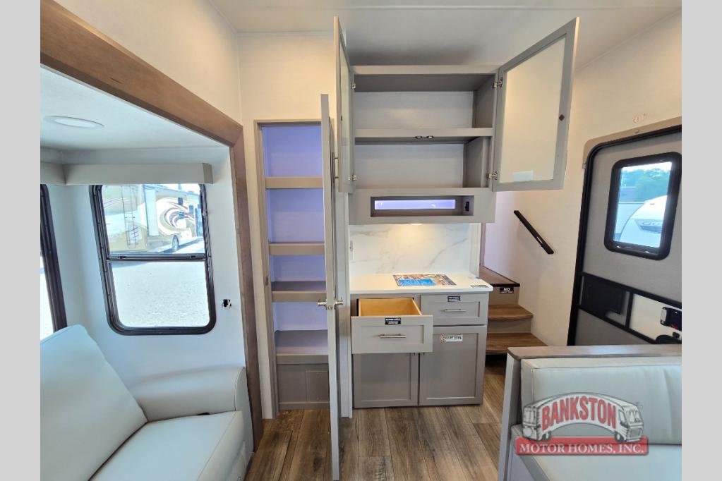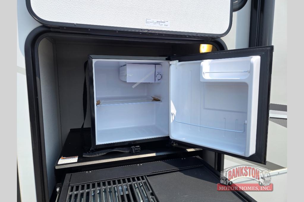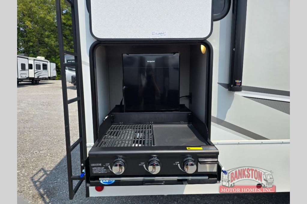 This fifth wheel is ready for adventure when you are! Once you arrive at the campground, you can put out the 16' awning, then start lunch on the exterior griddle. A booth dinette and theater sofa provide seating space inside, and there is a 50" Class HDTV to enjoy movies. The chef will also love the interior kitchen with its ample counter space, and there is plenty of storage with a hutch/pantry, second pantry, and 10 cu. ft. 12V refrigerator. Freshen up in the full bath before heading off to bed in the front private bedroom. Here, you'll find a queen bed, dual nightstands and overhead storage, plus a wardrobe with washer and dryer prep if you choose to add those appliances!