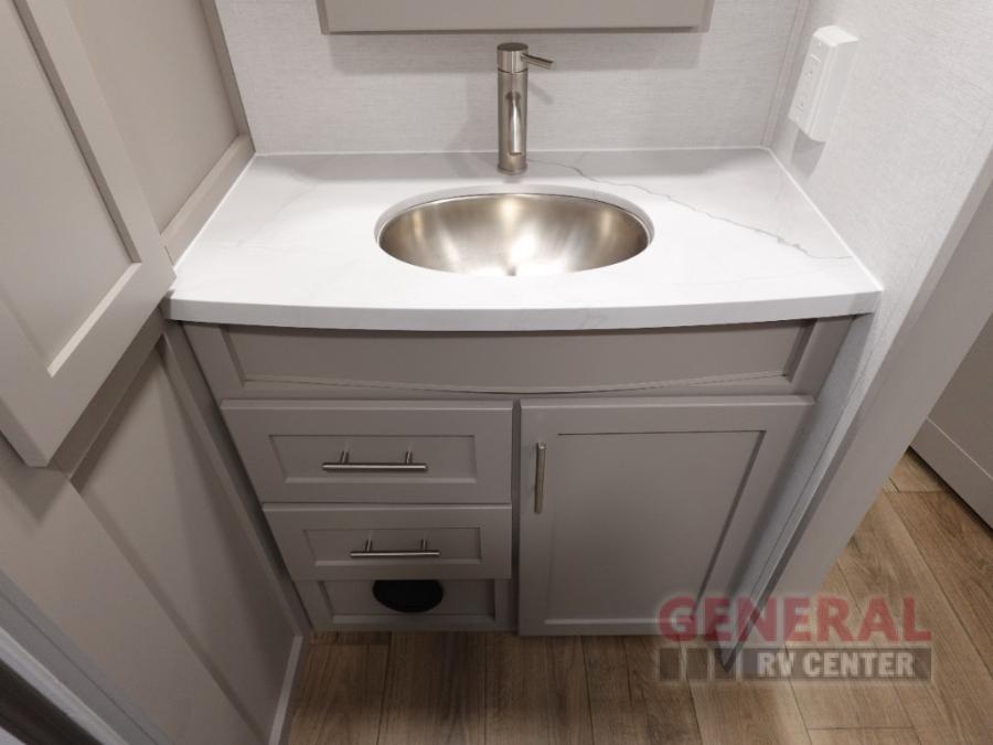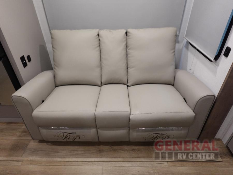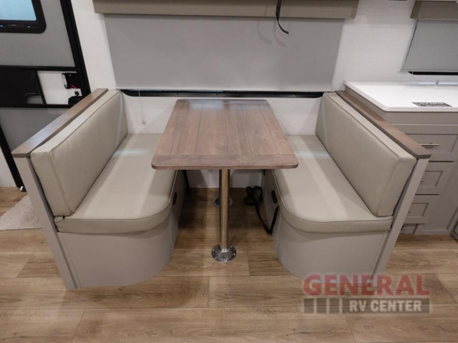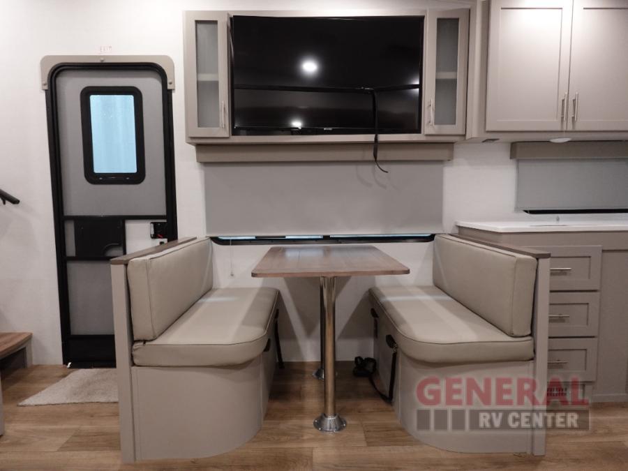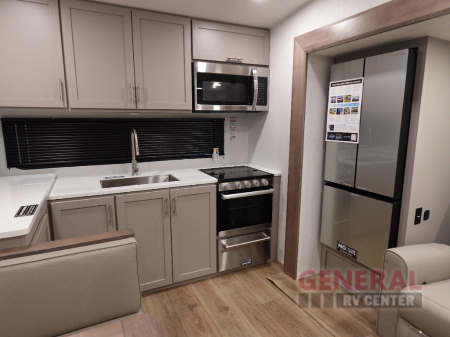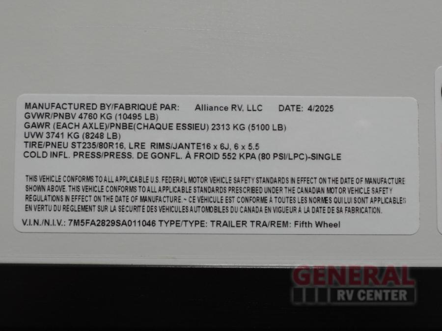 A benchmark chassis creates a space saver upper deck with each one of these Avenue All-Access fifth wheels by Alliance RV! The 101 in. wide-body construction gives you more room to walk around and the flush slide out floors throughout prevent any tripping. There are Azdel composite sidewalls inside and out, and a seamless fully walkable PVC roof for extreme durability and zero maintenance. You are sure to love no carpet throughout making each Avenue All-Access easy to clean and allergen free, not to mention pet friendly. You can maximize your space throughout with innovative storage solutions like the hidden storage behind the TV, inside the end tables, ottoman, and dinette chairs. These units also include the OTG Solar Package with a 200 watt solar panel, 15 amp MPPT charger, multiple outlets, and more to keep you powered up!