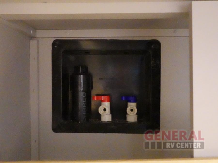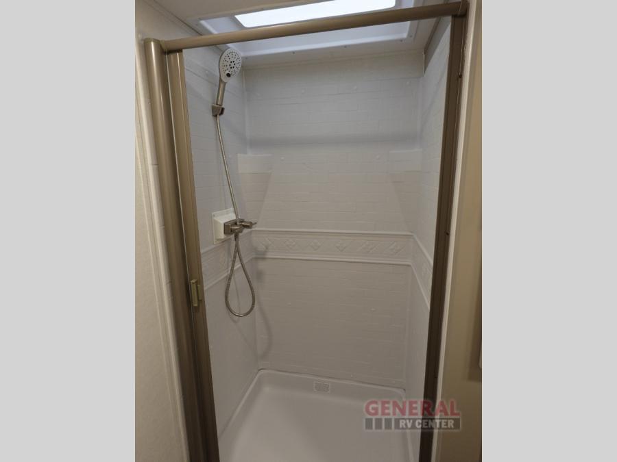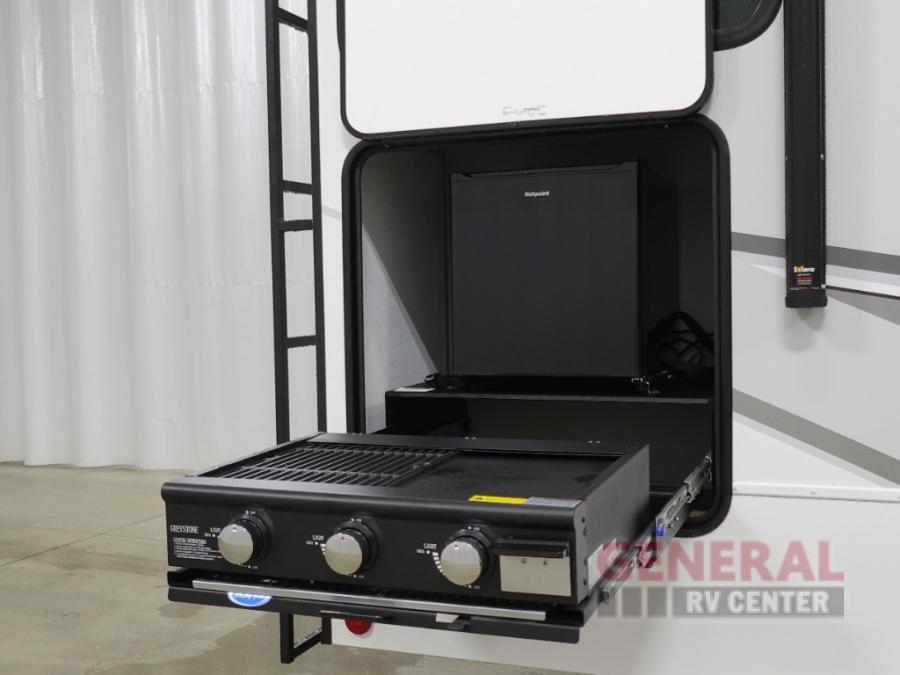 This fifth wheel is ready for adventure when you are! Once you arrive at the campground, you can put out the 16' awning, then start lunch on the exterior griddle. A booth dinette and theater sofa provide seating space inside, and there is a 50" Class HDTV to enjoy movies. The chef will also love the interior kitchen with its ample counter space, and there is plenty of storage with a hutch/pantry, second pantry, and 10 cu. ft. 12V refrigerator. Freshen up in the full bath before heading off to bed in the front private bedroom.